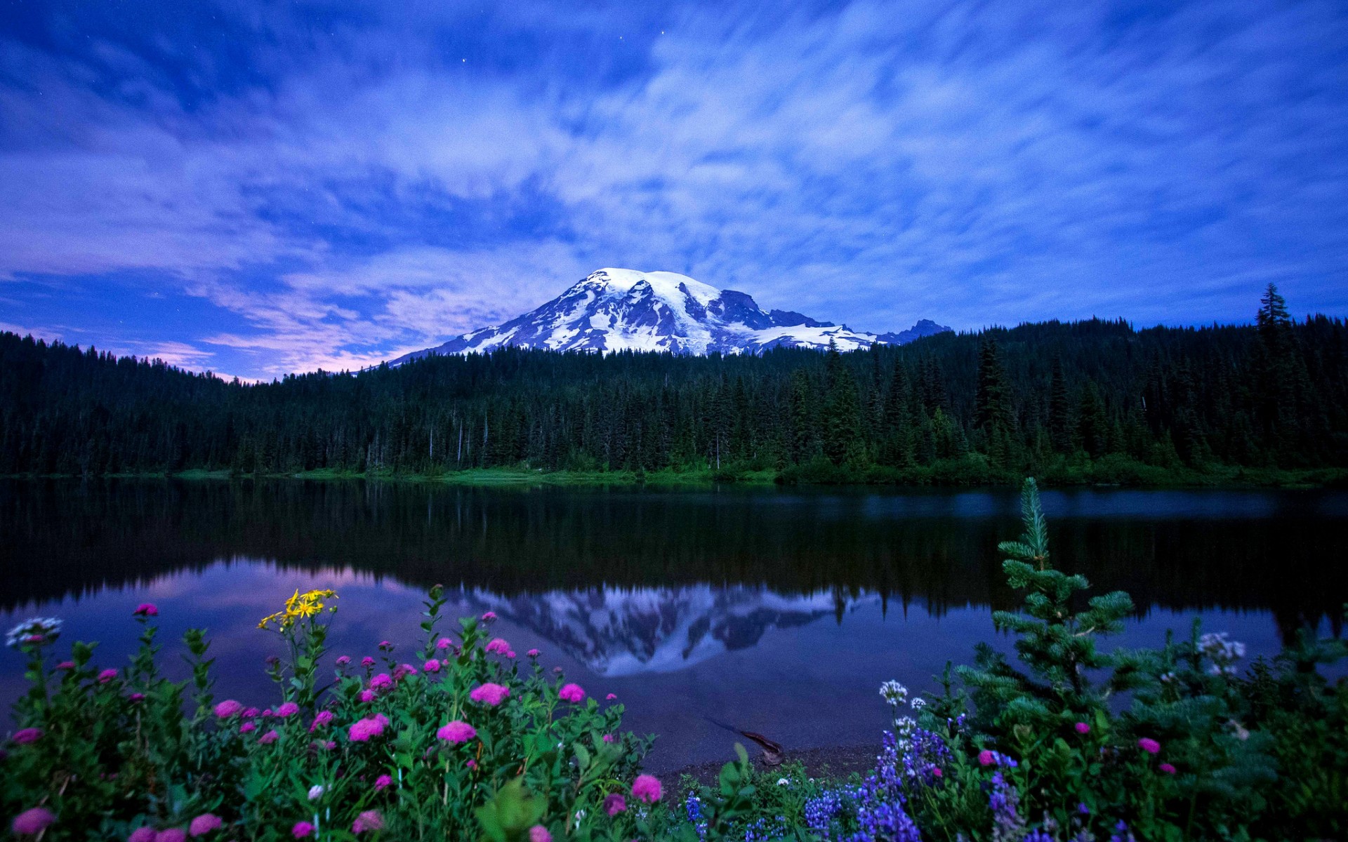 Description: A mountain is shown with a lake in the foreground and wildflowers in the foreground.