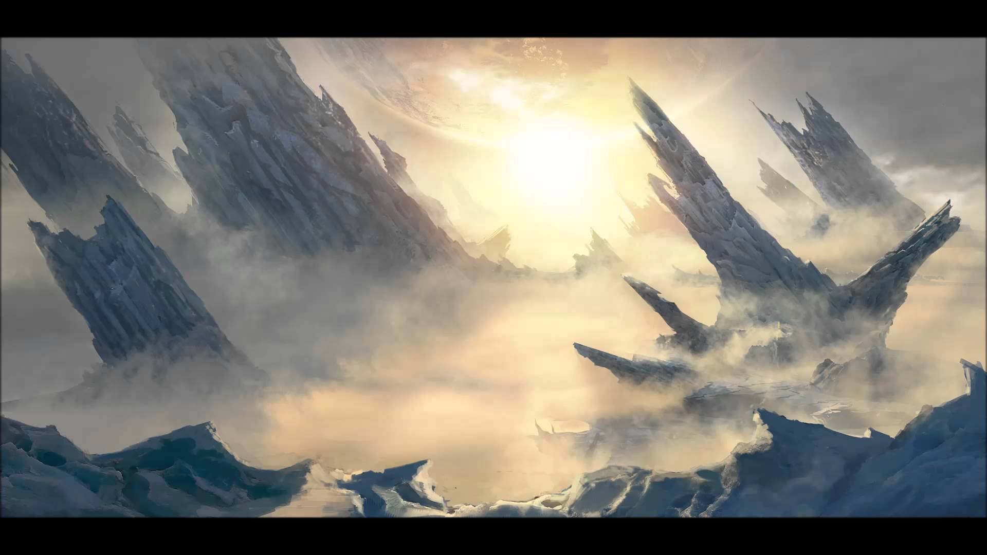 Description: A painting of a mountain landscape with a sun in the background and clouds in the foreground.