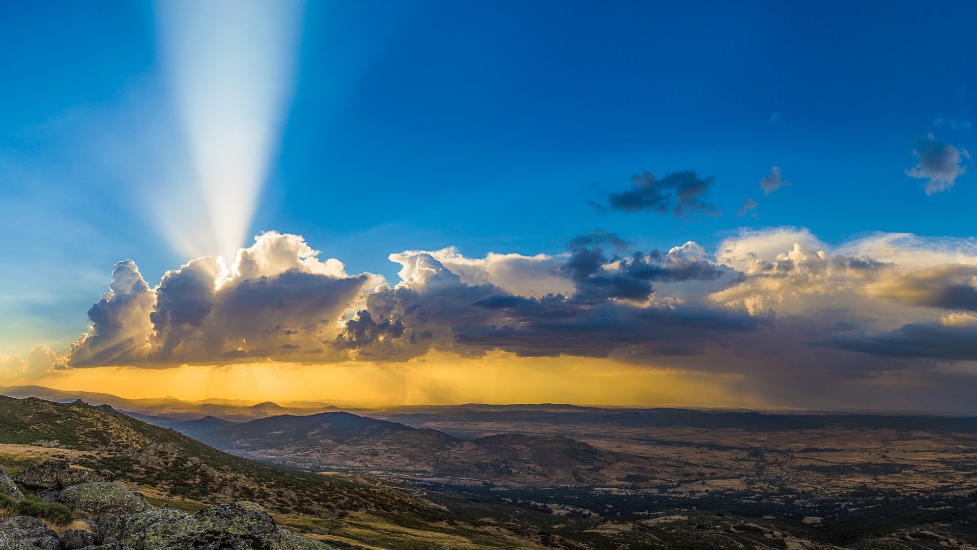 Description: A view of a mountain with a bright light coming from the clouds above it and a person on a mountain top.