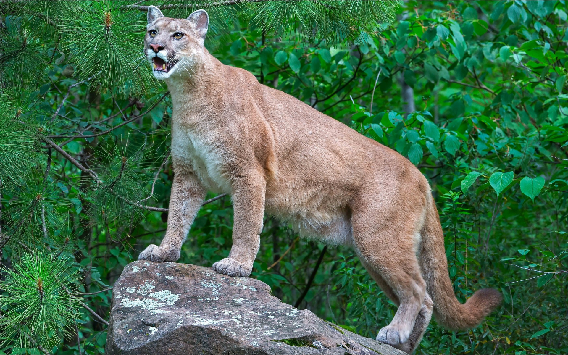 Description: A mountain lion standing on a rock in the woods with its mouth open and tongue out.