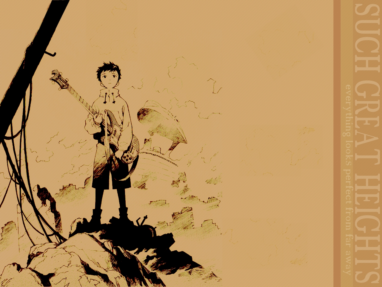Description: A man standing on top of a mountain holding a guitar and a microphone in his hand.
