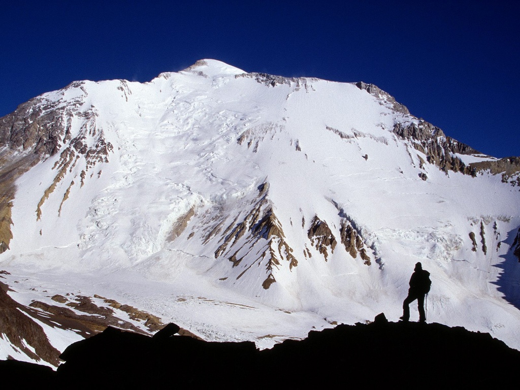 Description: A man standing on top of a snow covered mountain next to a snow covered mountain range with a snow covered peak.