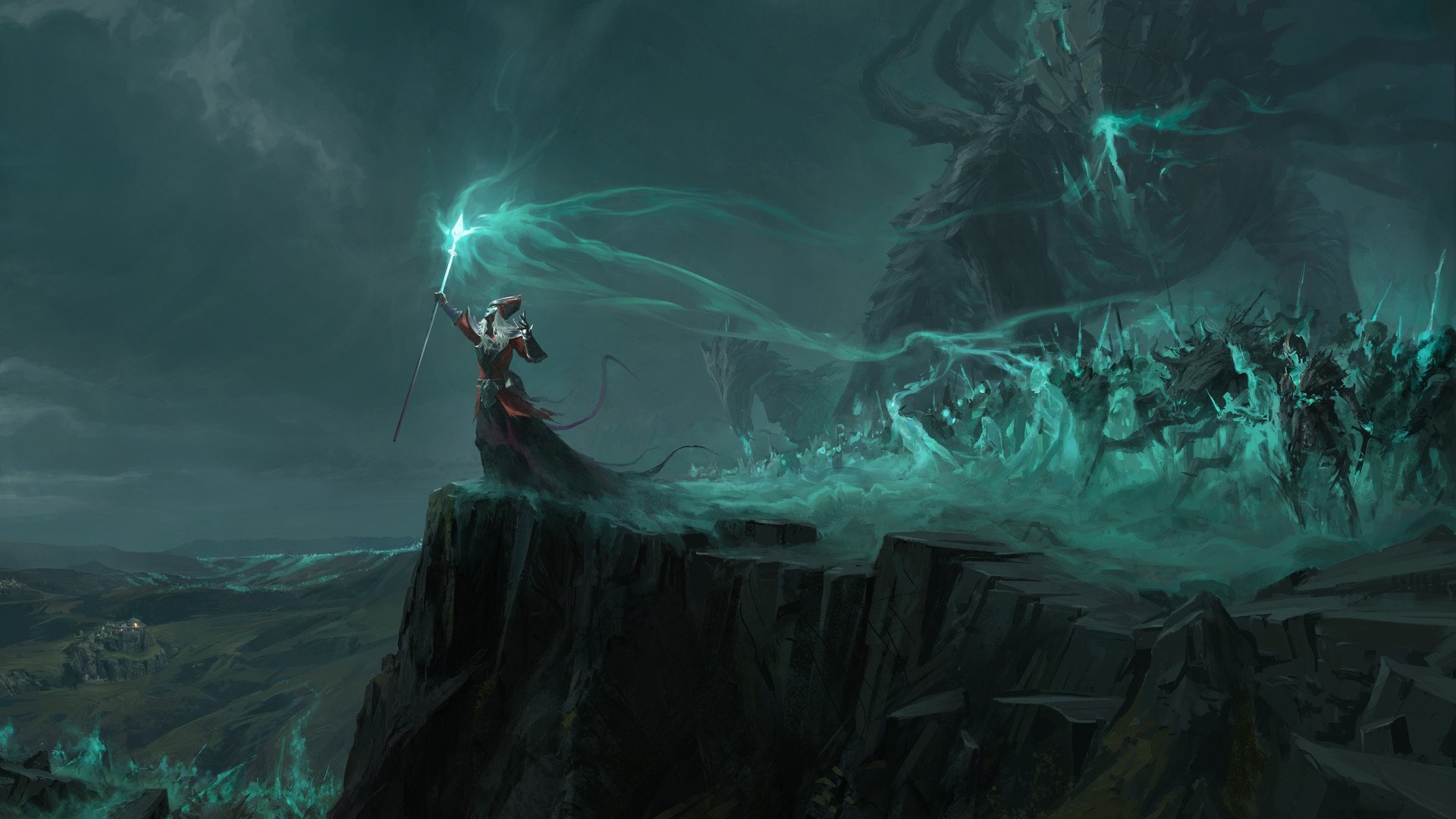 Description: A man standing on top of a mountain holding a sword in his hand and surrounded by monsters and rocks.