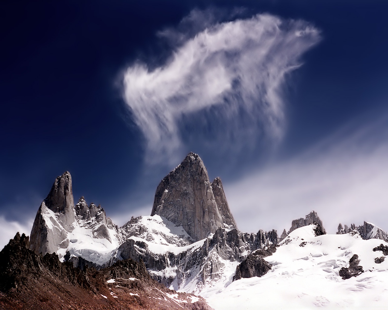 Description: A mountain range with a cloud in the sky above it and snow on the ground below it.