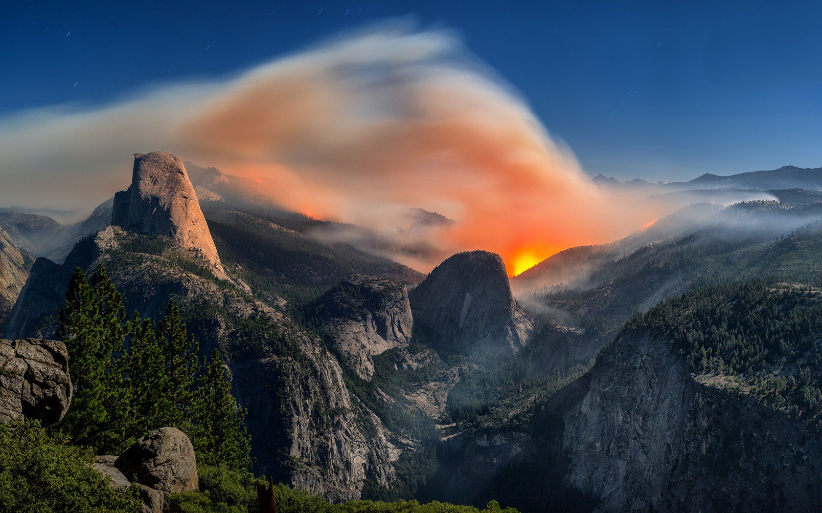 Description: A mountain range with a large cloud in the sky and a sunset in the distance with a red and yellow cloud.
