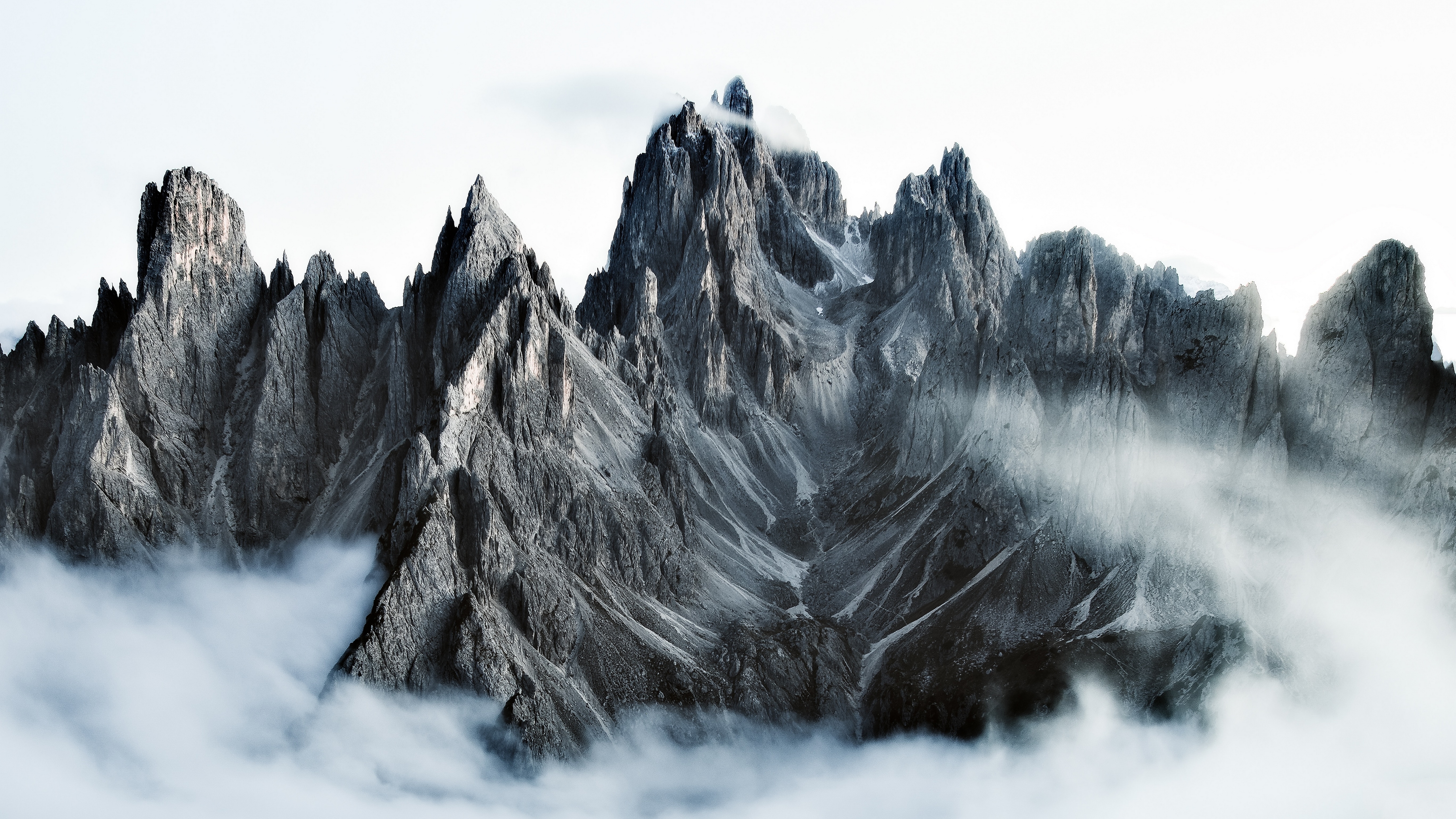 Description: A mountain range covered in clouds and snow in the daytime sky with a few clouds in the foreground.