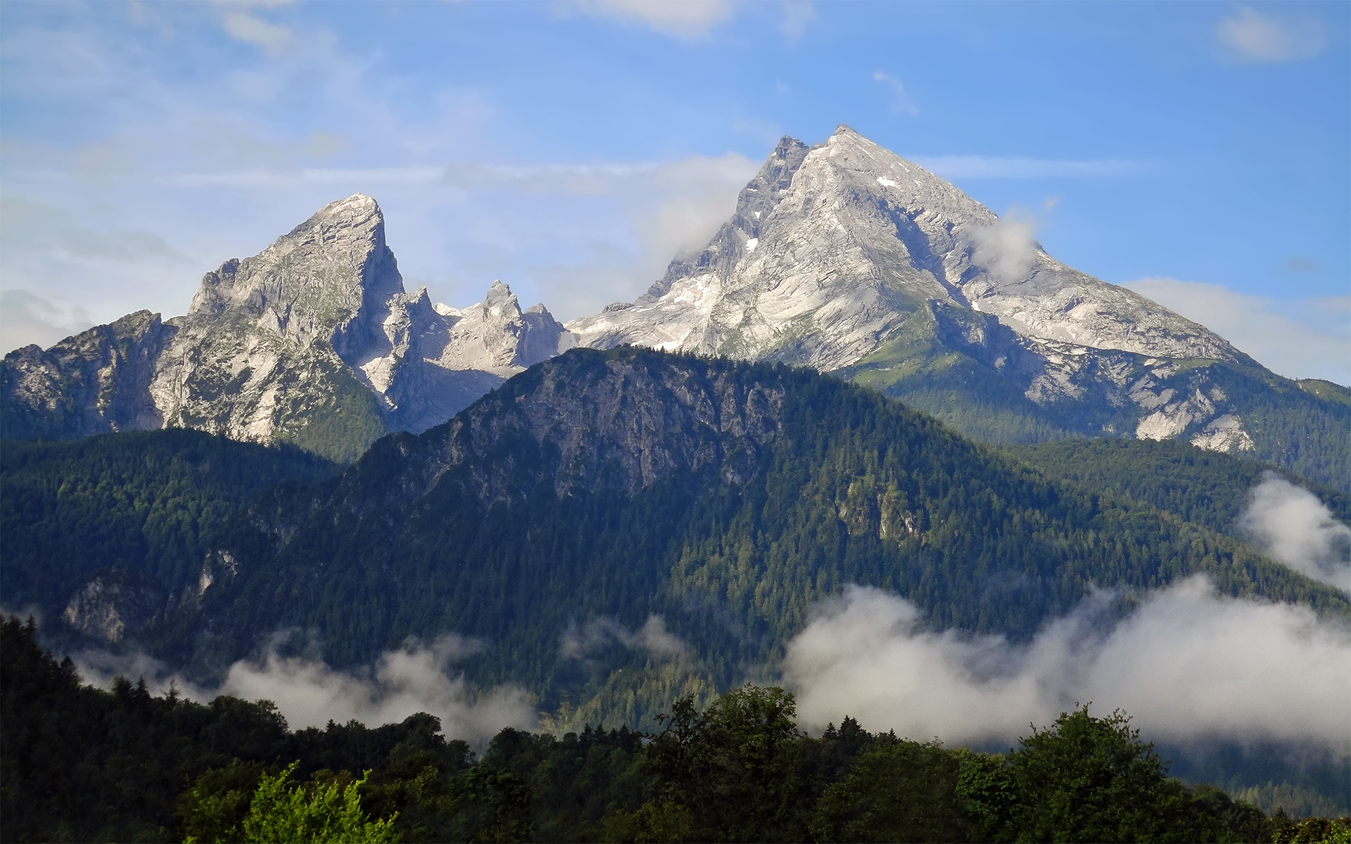 Description: A mountain range with a few clouds in the foreground and a few trees in the foreground.