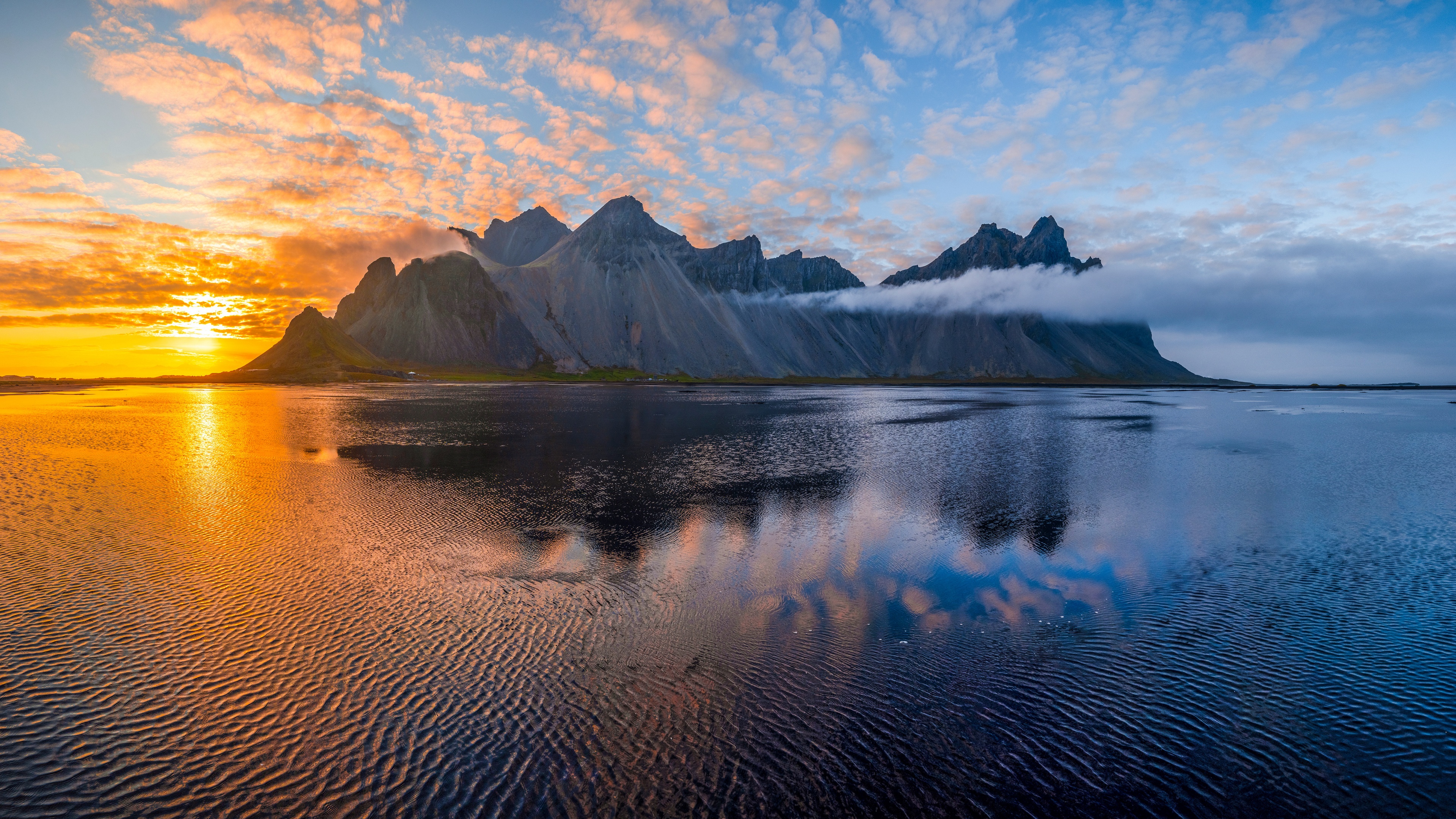 Description: A mountain range with clouds and a body of water in front of it at sunset or sunrise time with a reflection of the clouds in the water.