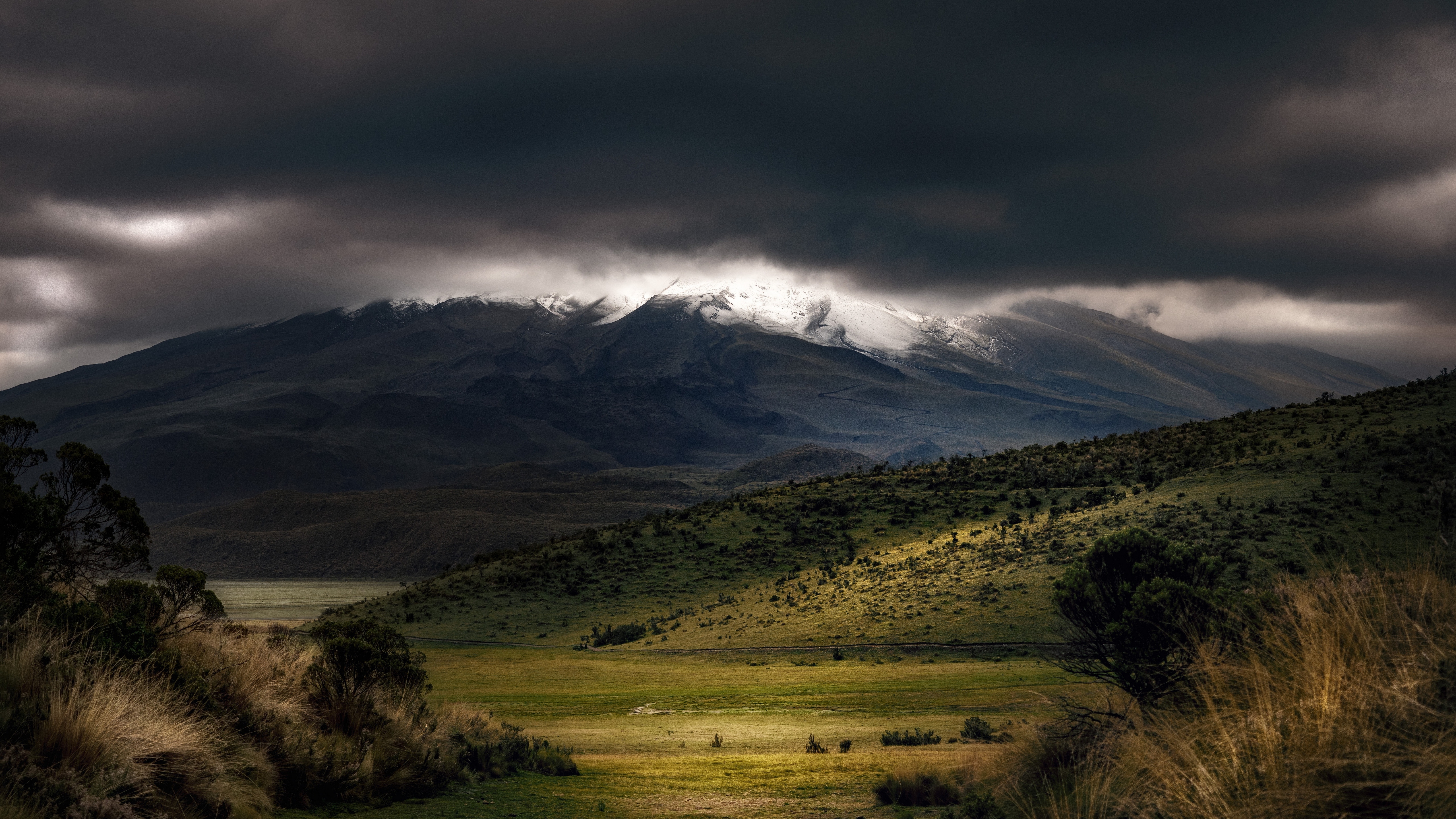 Description: A mountain range with a cloudy sky above it and a path leading to it in the foreground with a grassy field below.