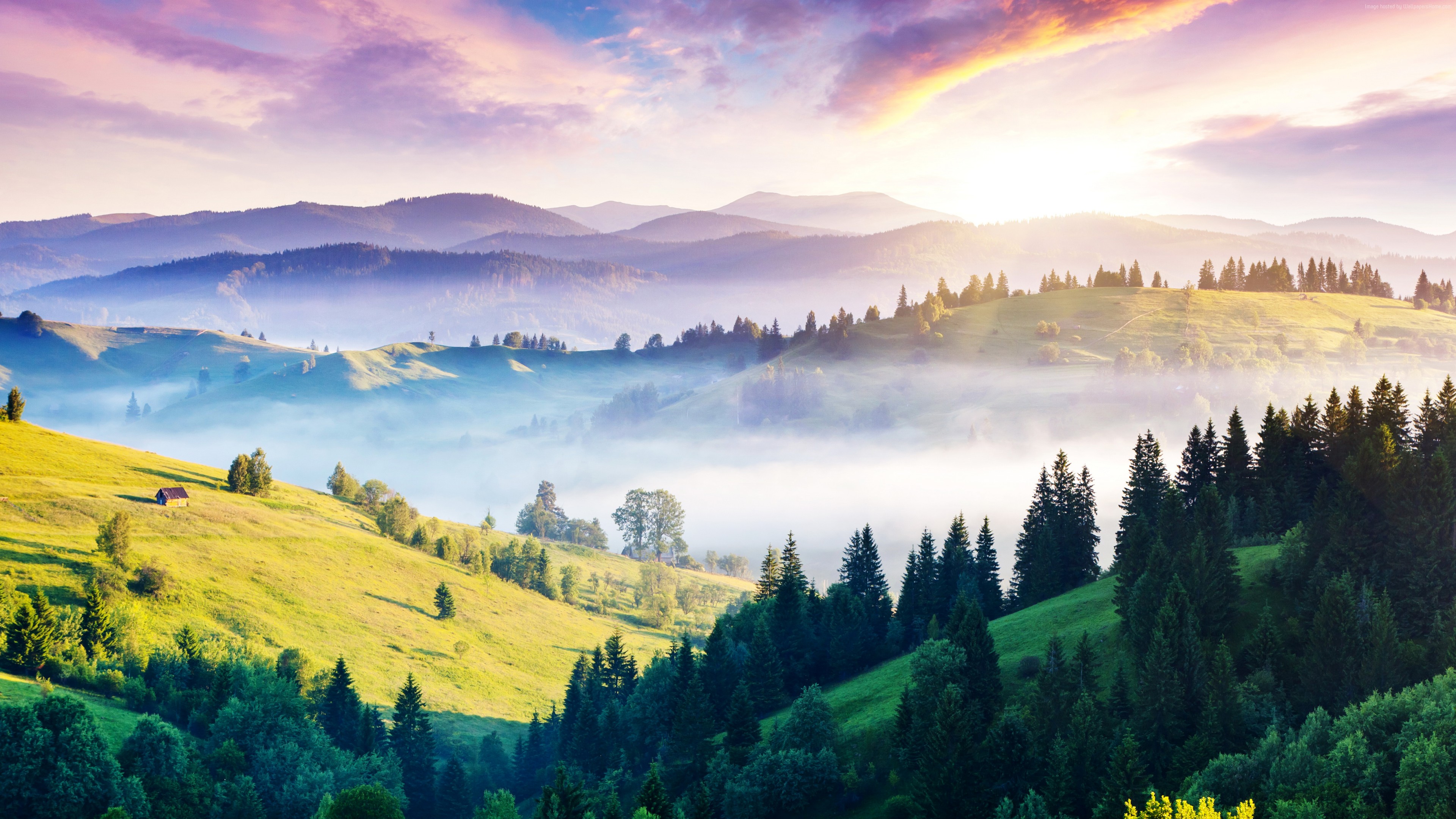 Description: A scenic view of a mountain range with a house in the distance and a foggy valley below it.
