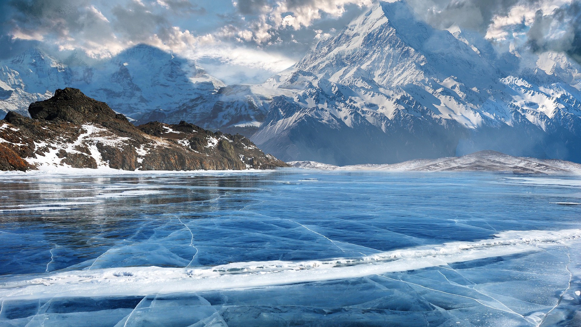 Description: A mountain range is seen in the distance from a frozen lake with ice on it and snow on the ground.