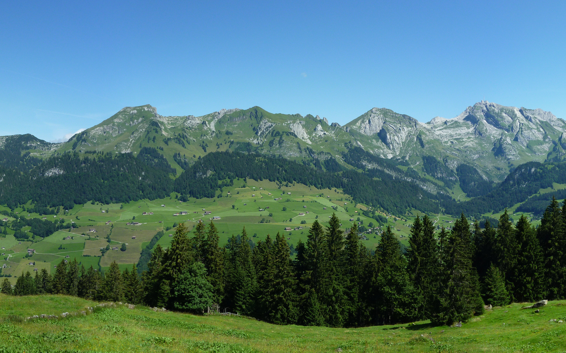 Description: A mountain range with a grassy field and trees in the foreground and a grassy field in the foreground.