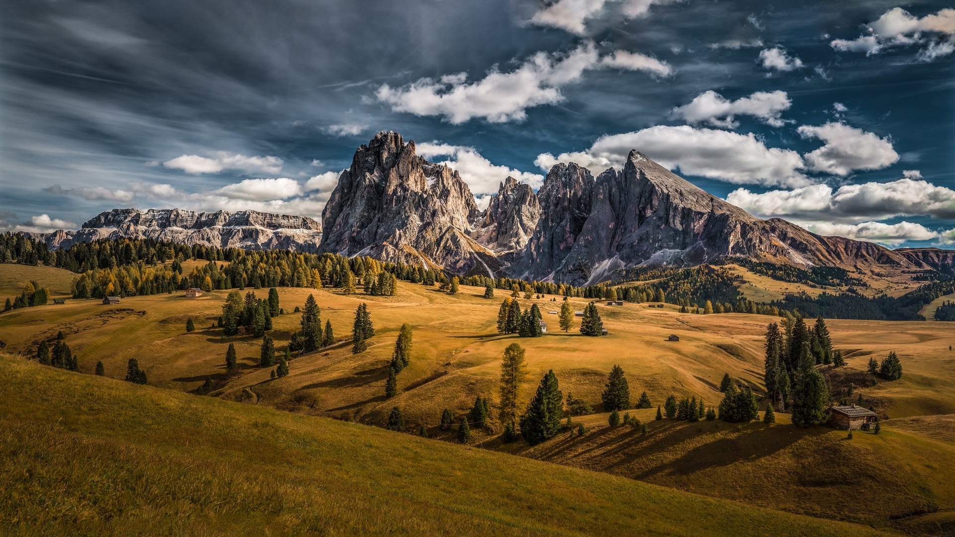 Description: A mountain range with a house in the foreground and a cloudy sky above it with a few clouds.