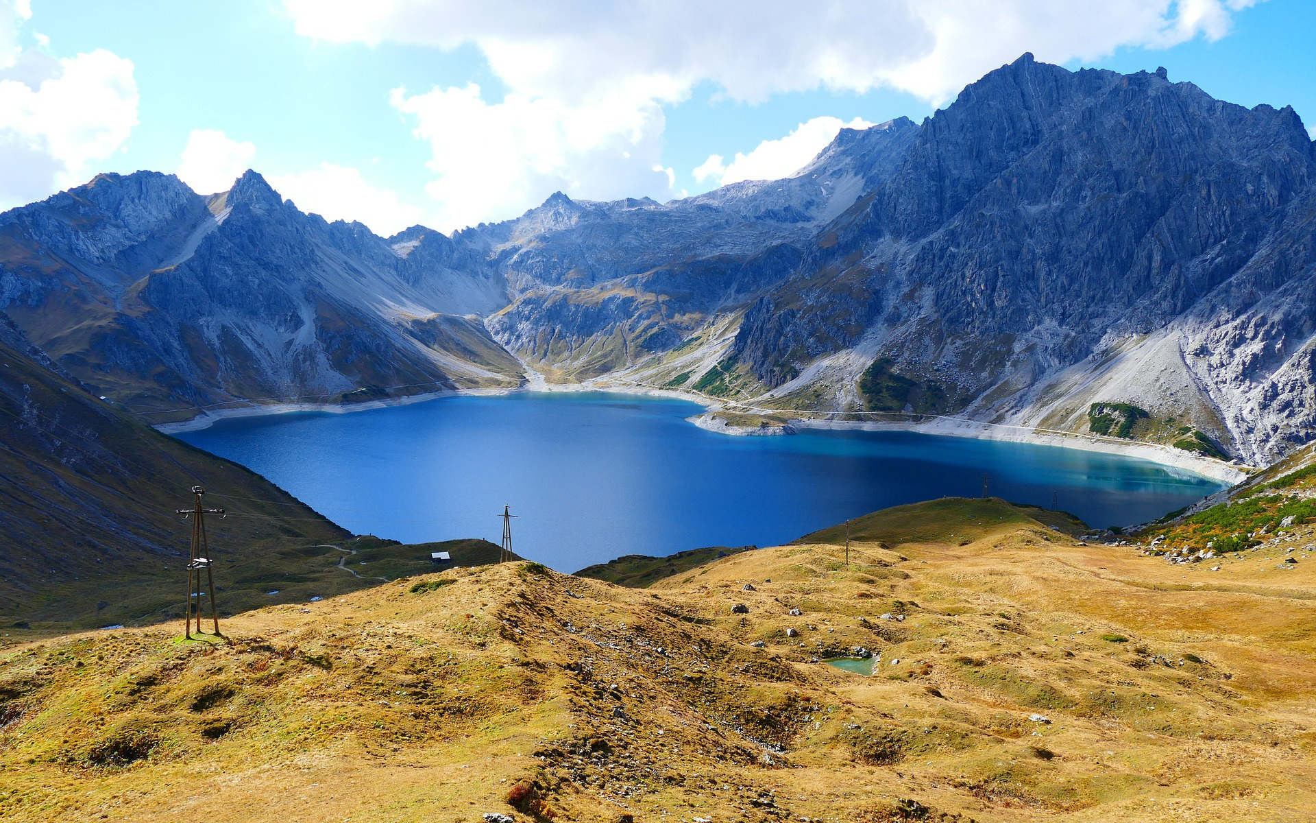 Description: A mountain range with a lake in the middle of it and a few mountains in the background with a blue sky.