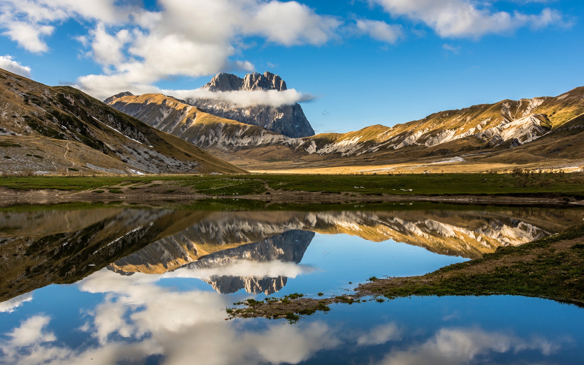 Description: A mountain range with a lake in the foreground and a few clouds in the sky above it and a few mountains in the background.