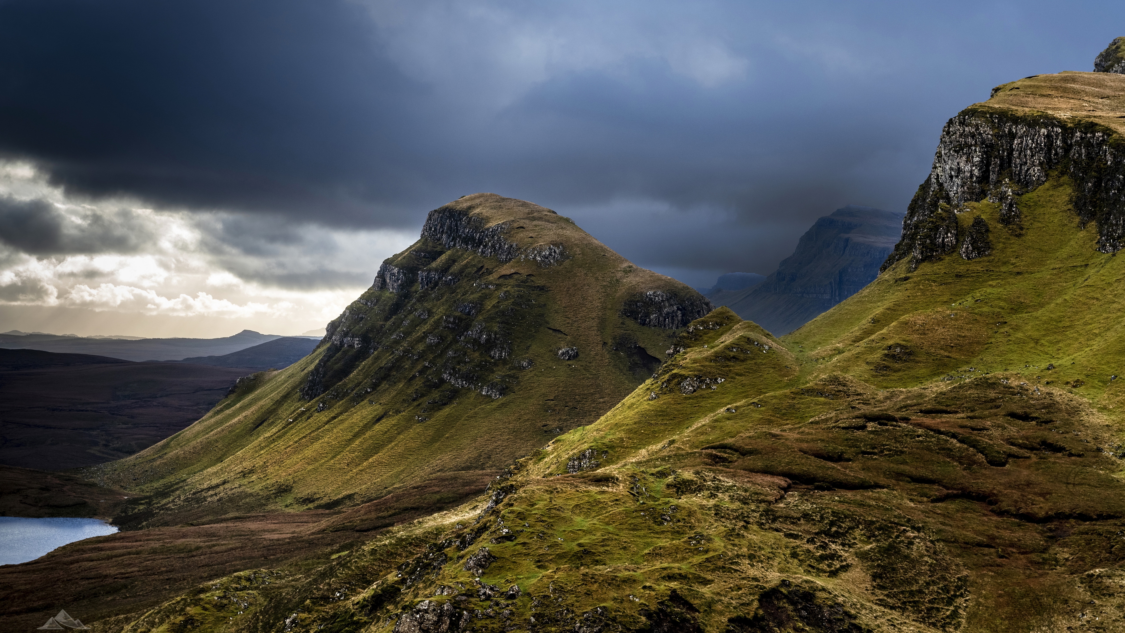 Description: A mountain range with a lake below it and a dark sky above it with clouds in the distance and a few mountains in the foreground.