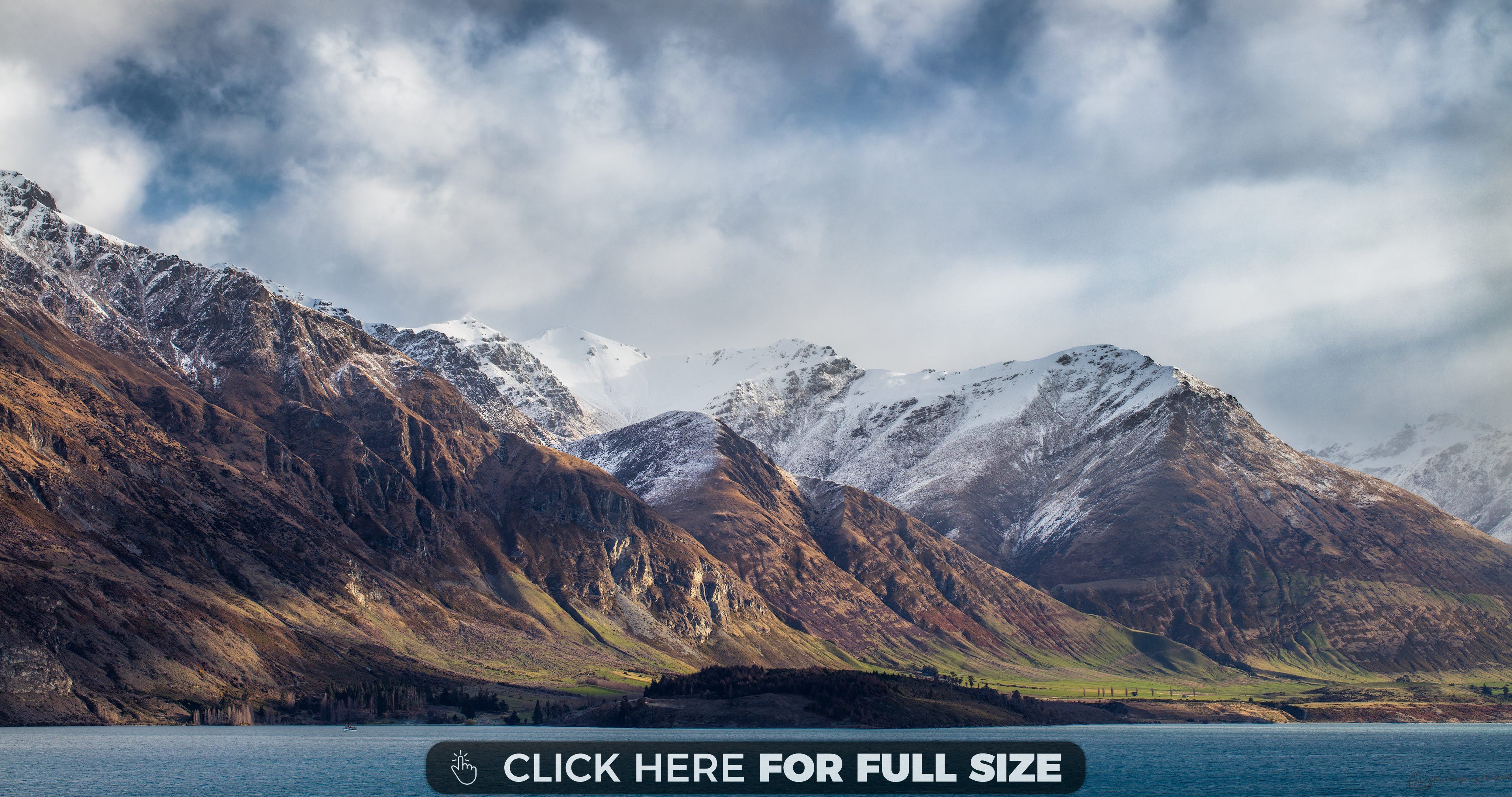Description: A mountain range with a lake below it and a cloudy sky above it with a sign that says click here for full size.