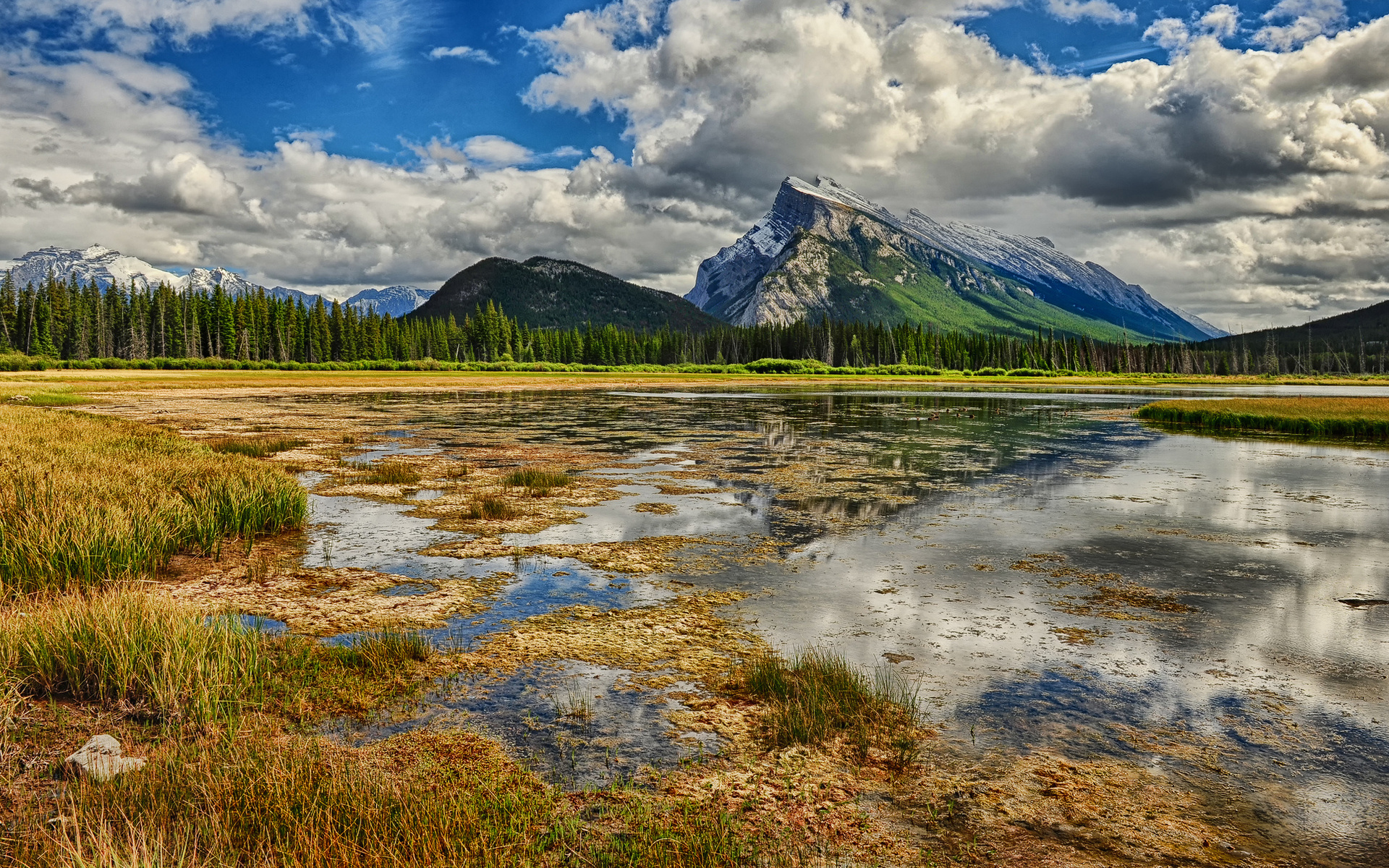 Description: A mountain range with a lake in the foreground and a forest in the background with clouds in the sky.