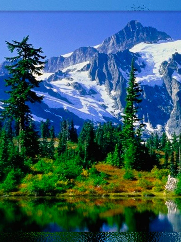 Description: A mountain range with a lake in the foreground and trees in the foreground.