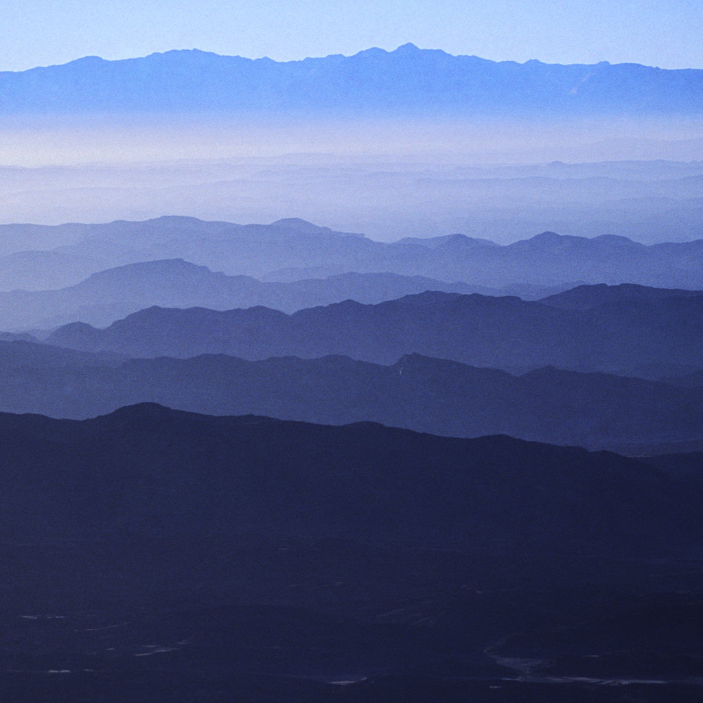 Description: A view of a mountain range from a plane window with a blue sky and some clouds in the background.