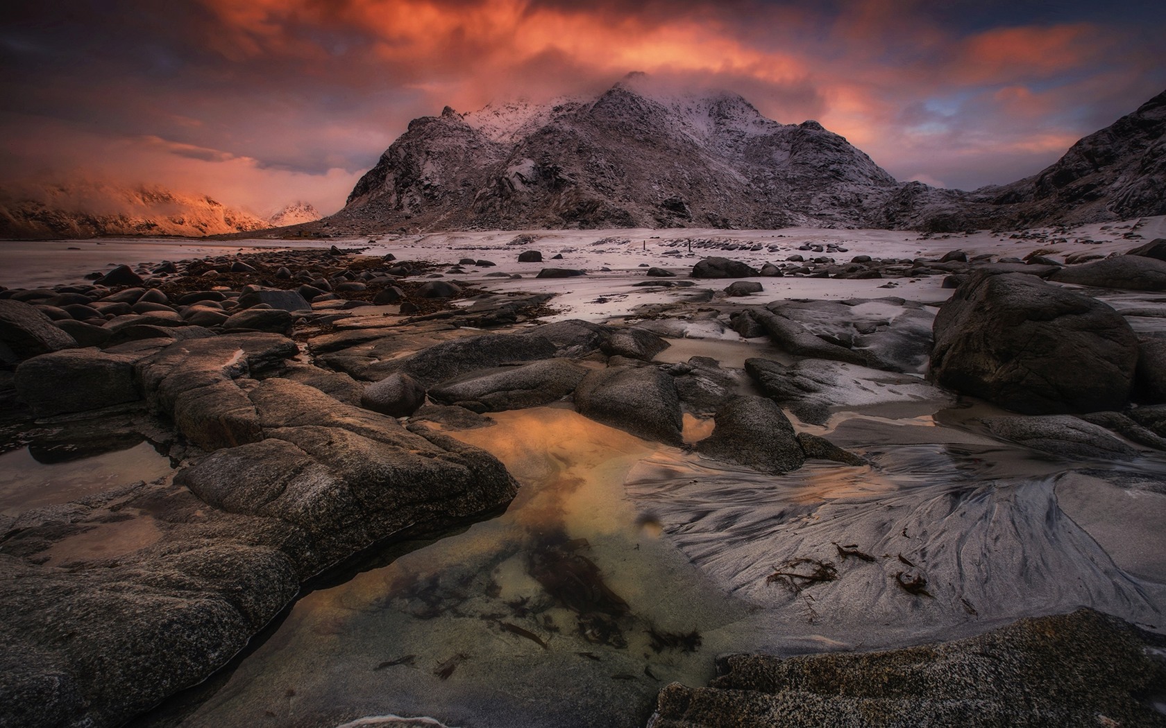 Description: A mountain range with a pool of water in the foreground and a cloudy sky above it.