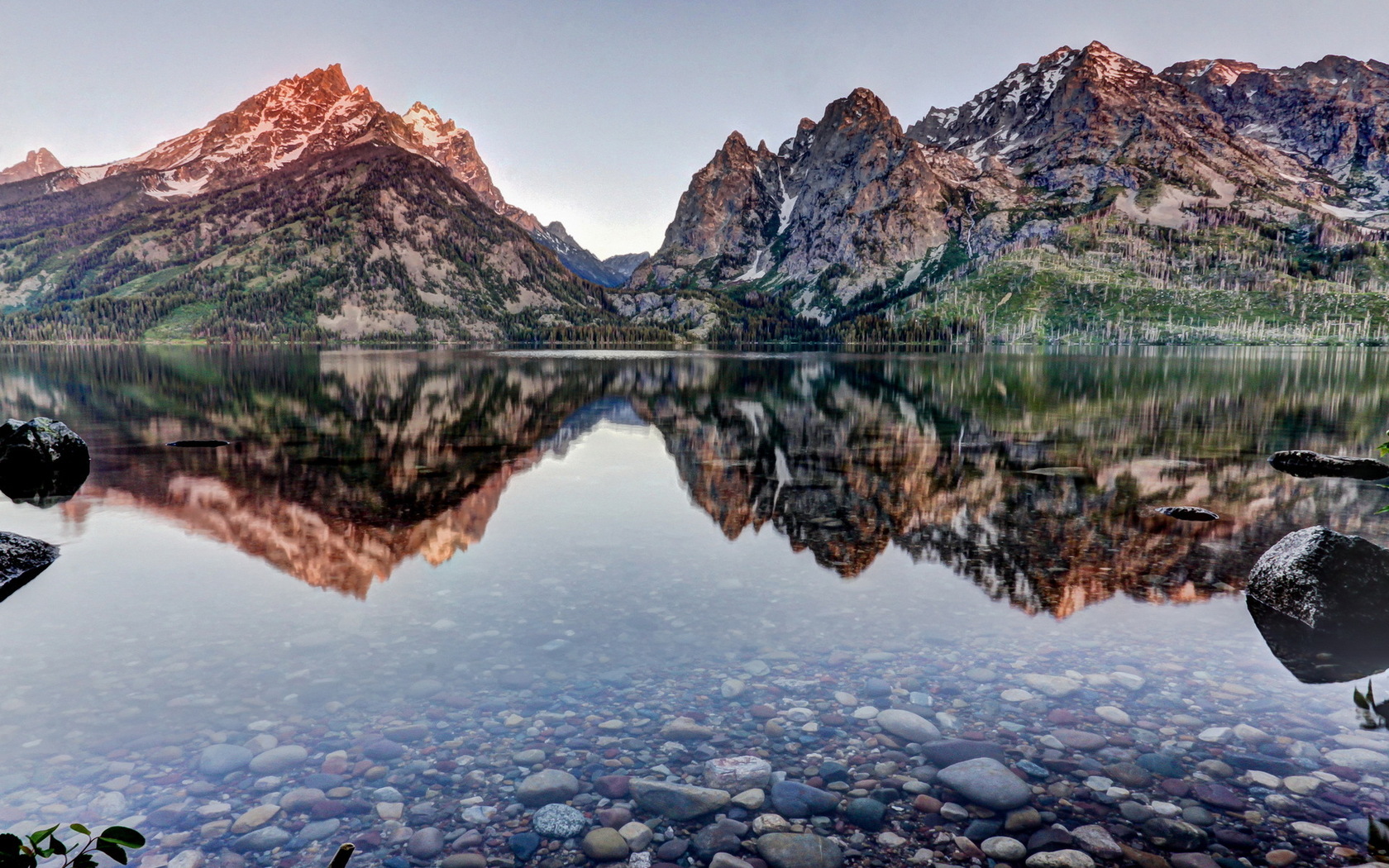 Description: A mountain range is reflected in a still lake with rocks and pebbles on the shore and a few trees in the foreground.