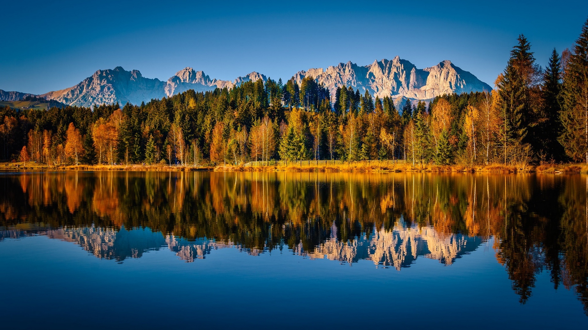 Description: A mountain range is reflected in a lake with trees in the foreground and a blue sky in the background.