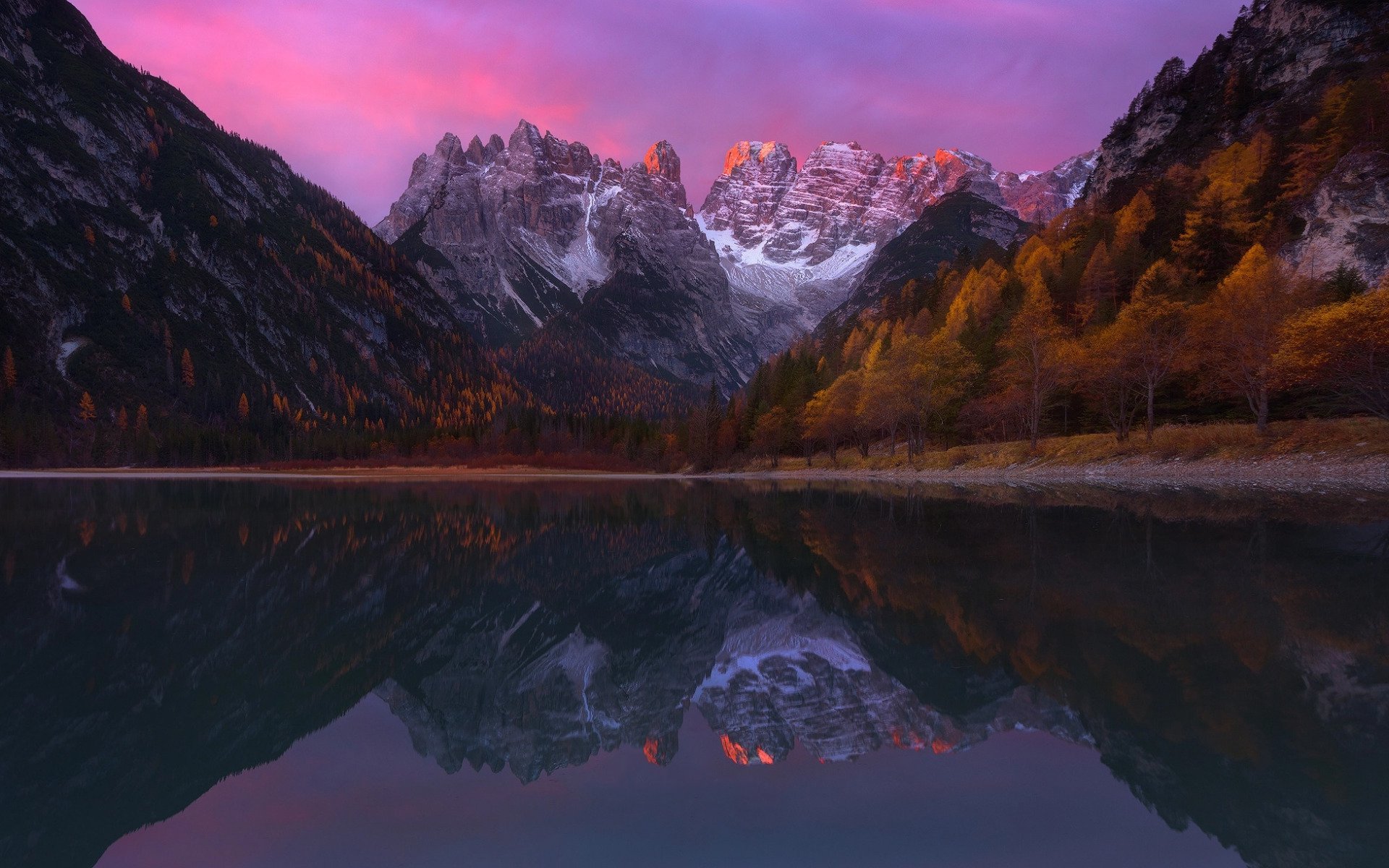 Description: A mountain range is reflected in a lake at sunset with a pink sky in the background and a pink sky in the foreground.