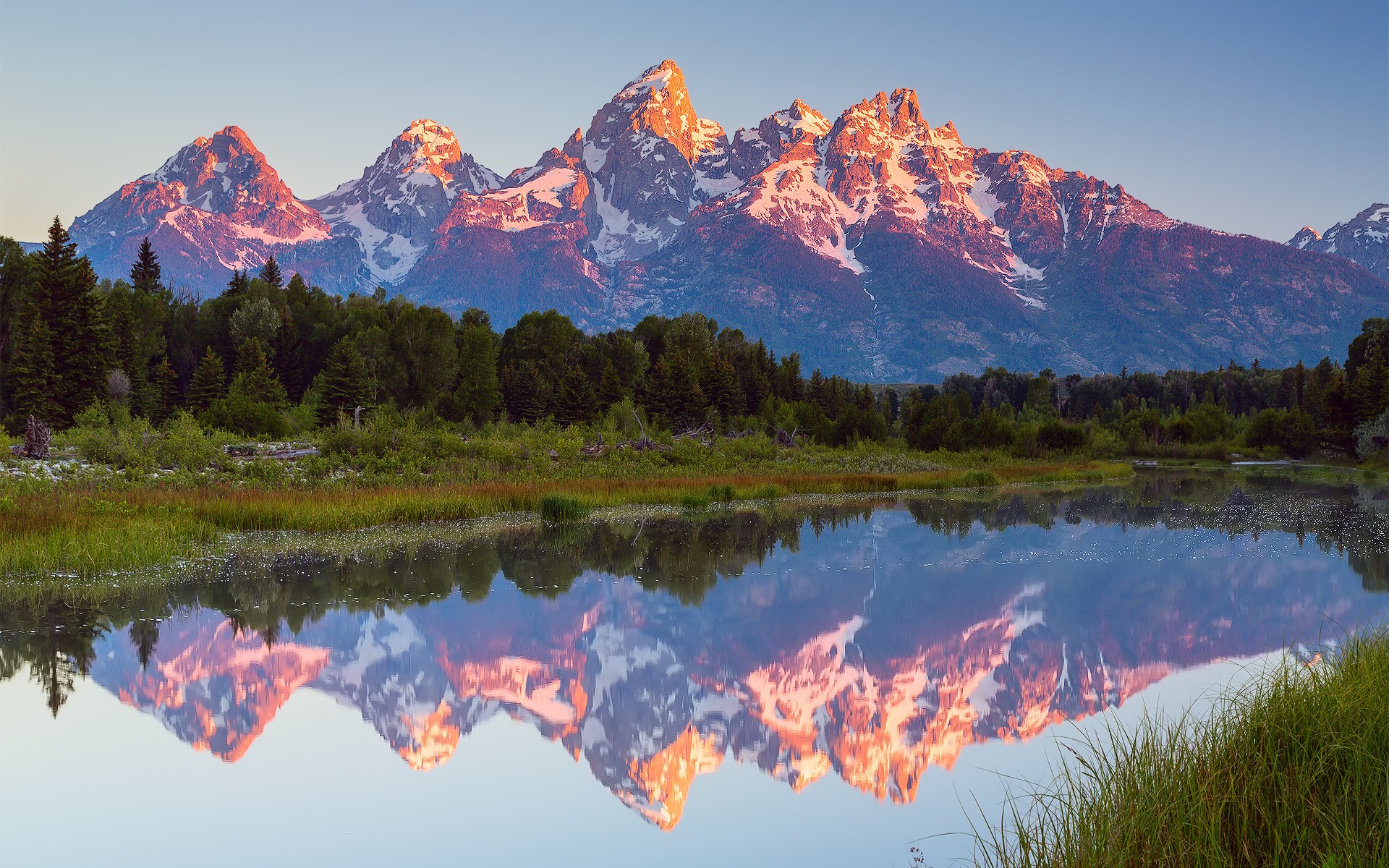 Description: A mountain range is reflected in a lake at sunset with a pink sky and green grass in the foreground.