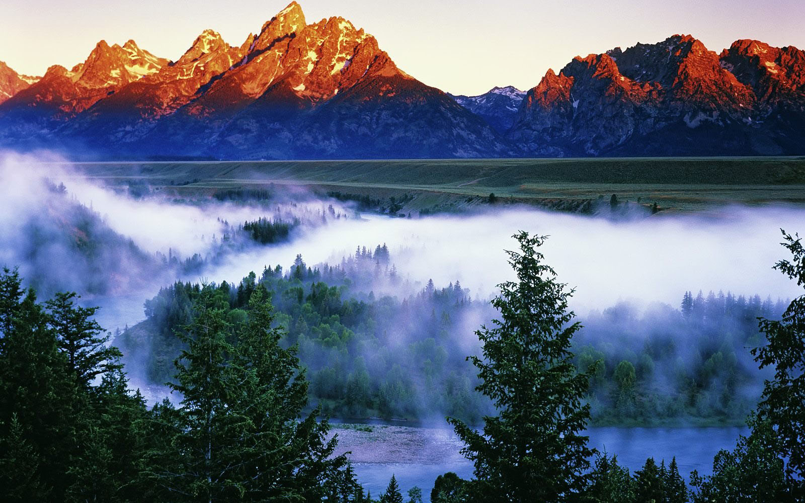 Description: A mountain range with a river and trees in the foreground and a foggy valley below it with mountains in the background.
