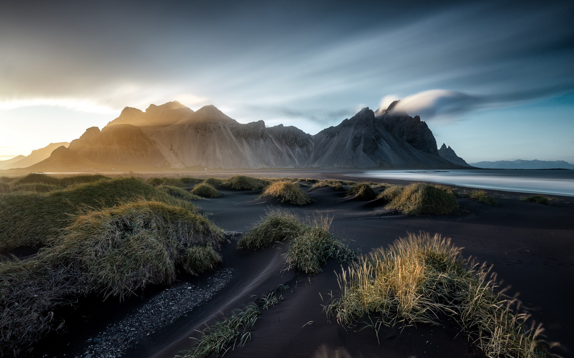 Description: A mountain range with a road running through it and grass growing on the ground below it and a body of water in the foreground.