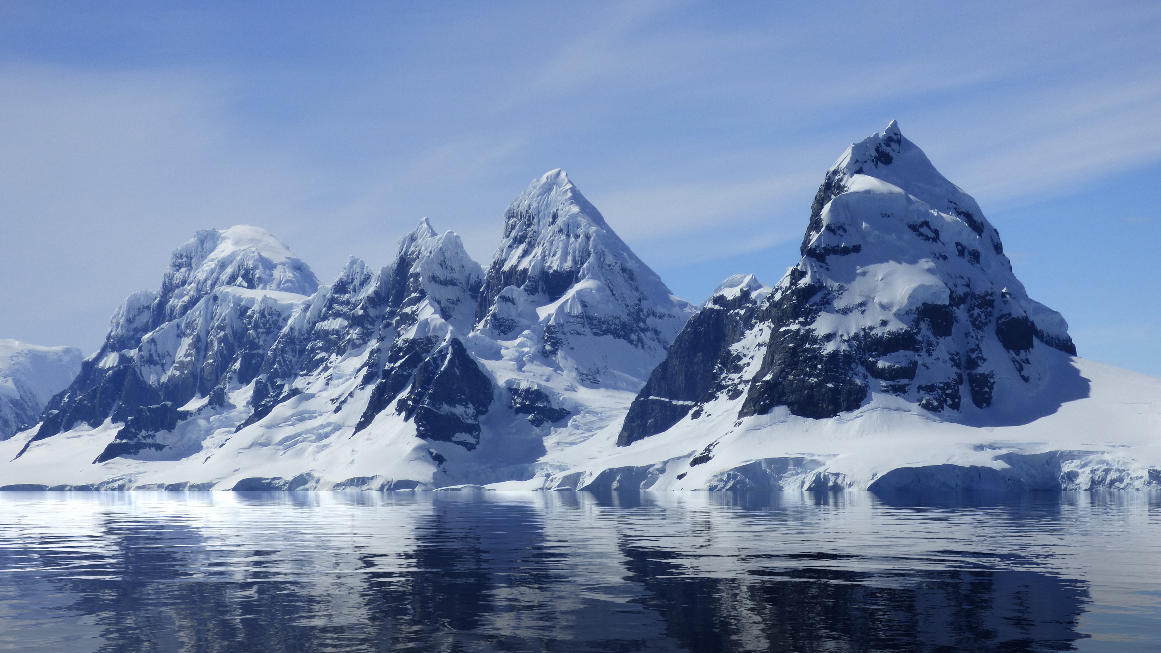 Description: A mountain range covered in snow and ice with water below it and a blue sky above it with clouds.
