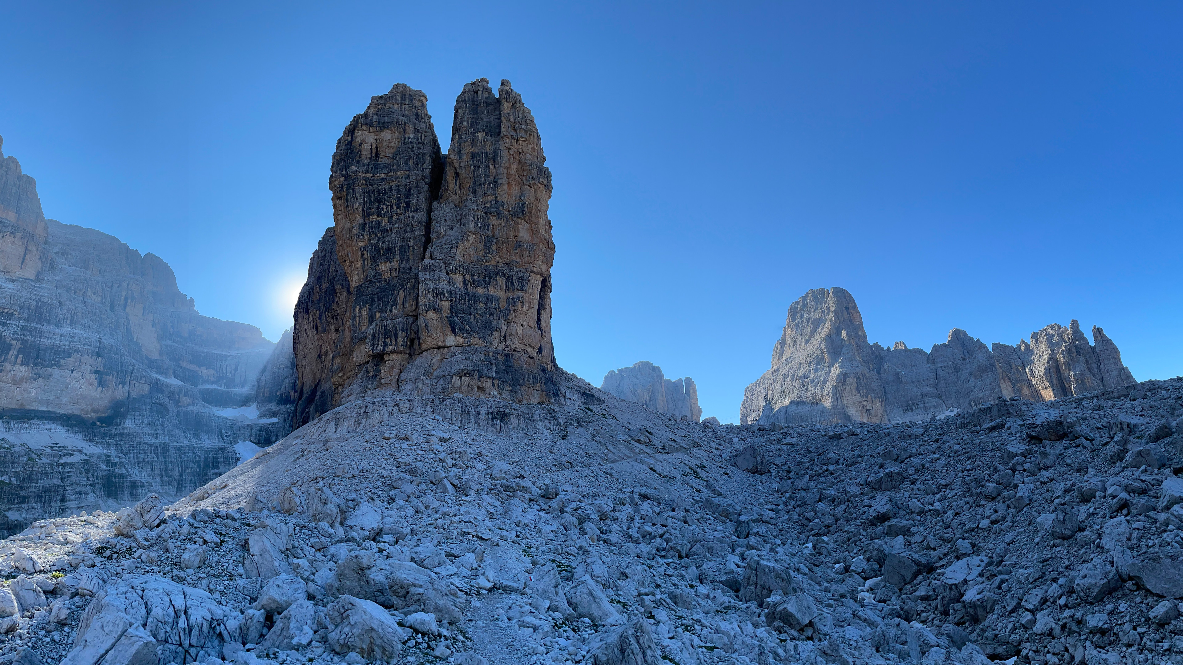 Description: A mountain range with a few rocks and a few snow on it and a sun shining in the sky.