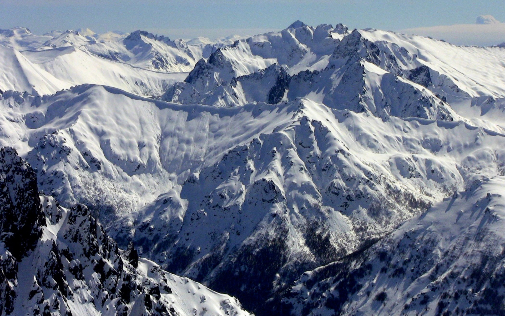Description: A view of a mountain range covered in snow from a plane window looking down on it's snow covered mountains.