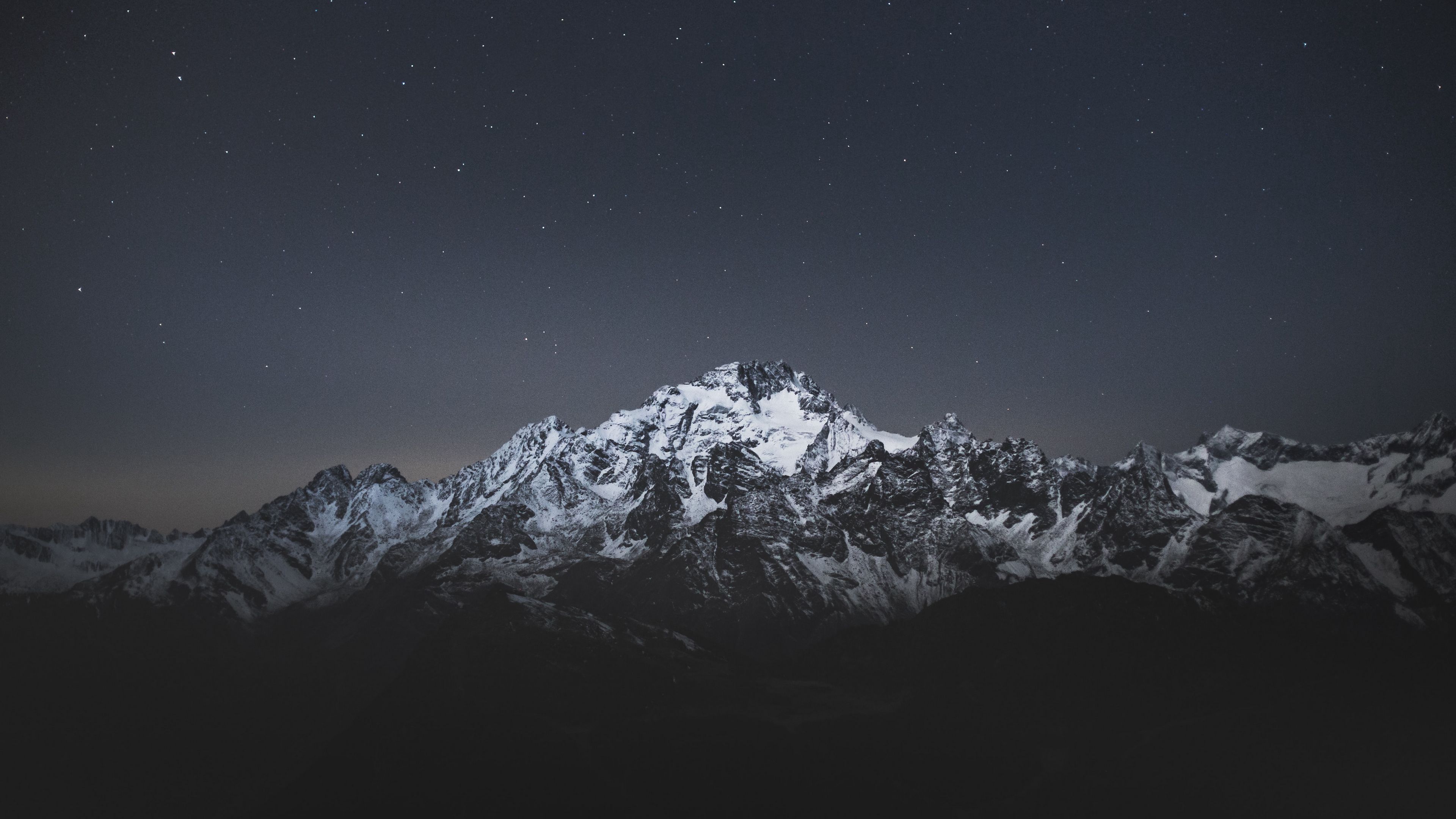 Description: A mountain range with a star filled sky above it and stars above it in the distance.