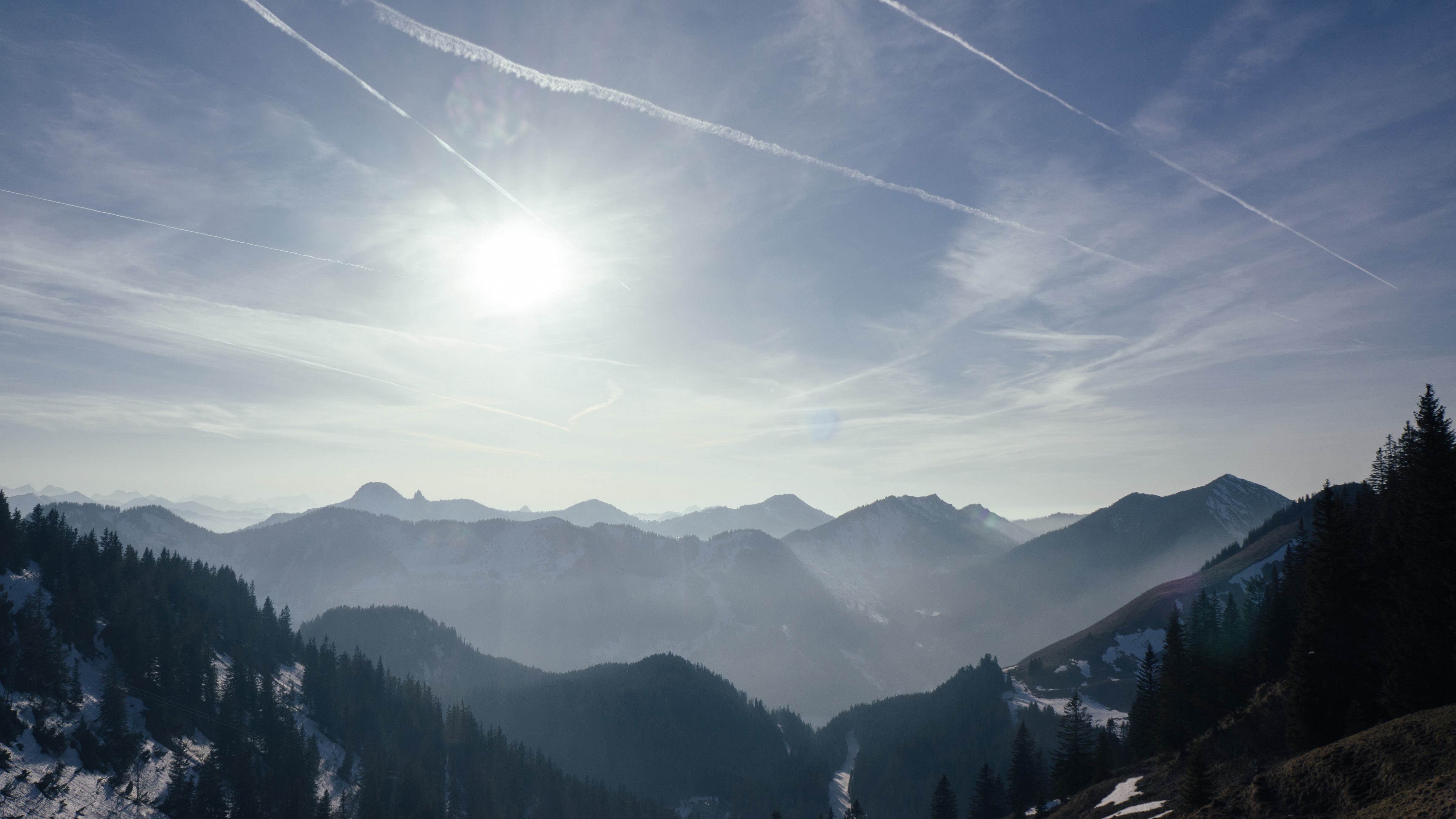 Description: A view of a mountain range with a sun in the sky and some trees in the foreground and a few contrails in the sky.