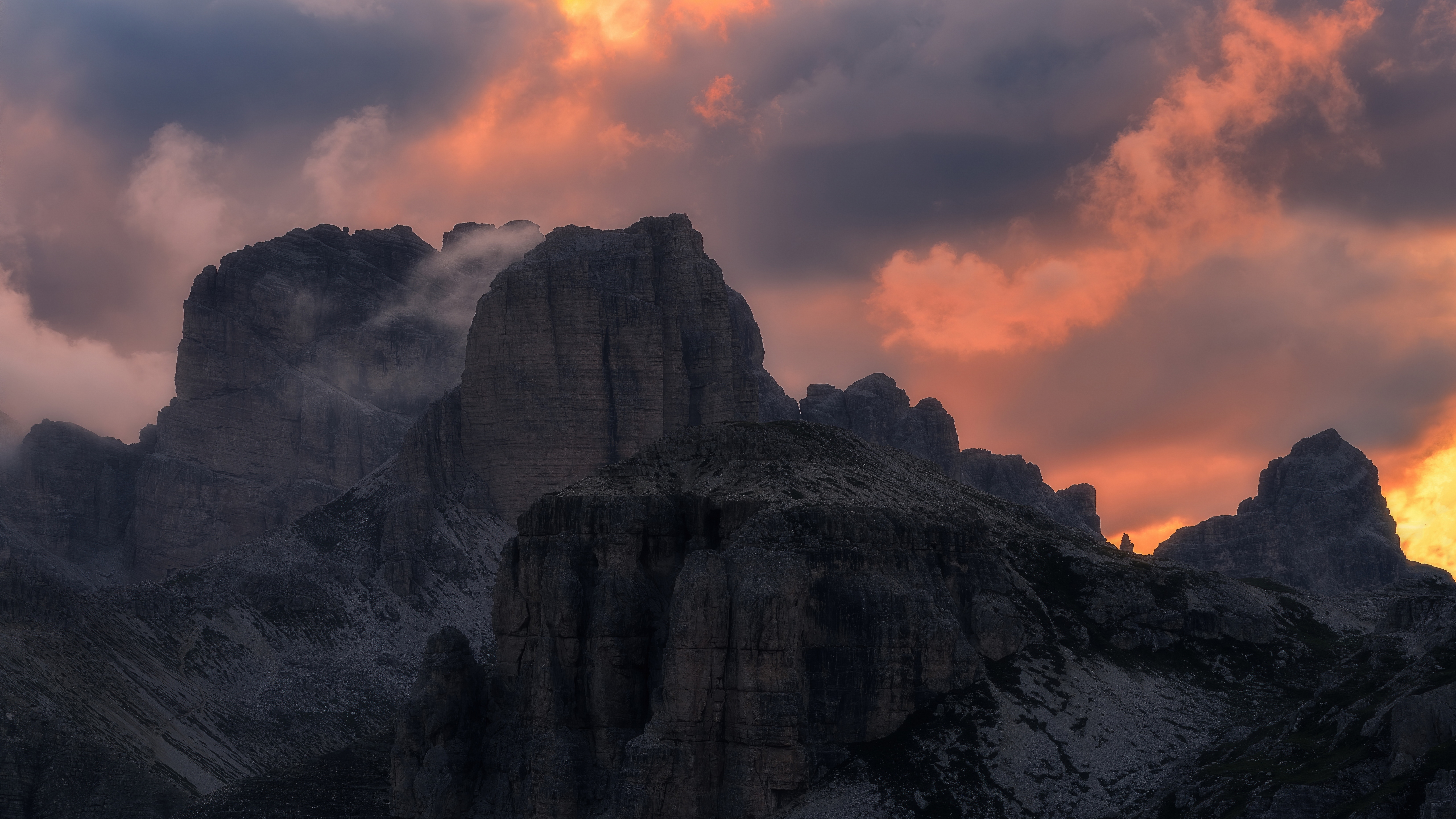 Description: A mountain range with a sunset in the background and clouds in the sky above it.