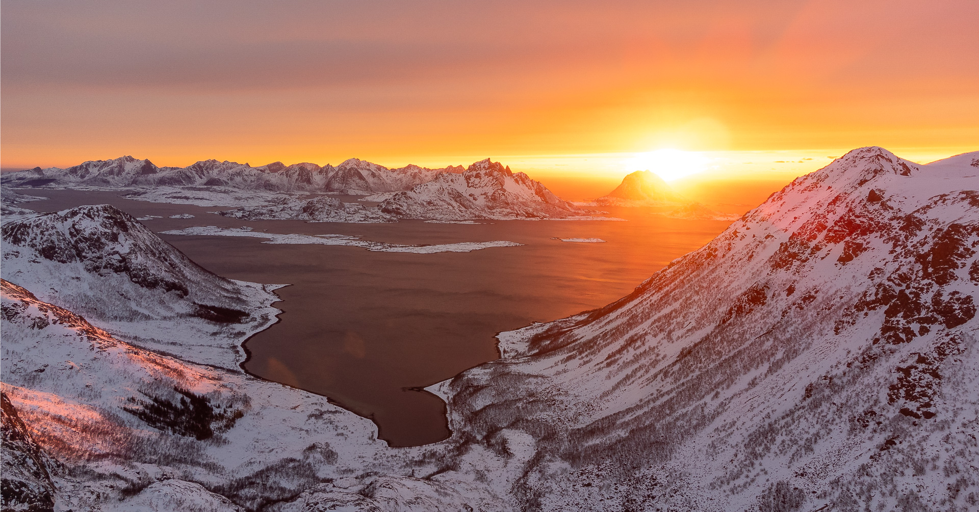 Description: A mountain range with a sunset in the background and a lake in the foreground with snow on the ground.
