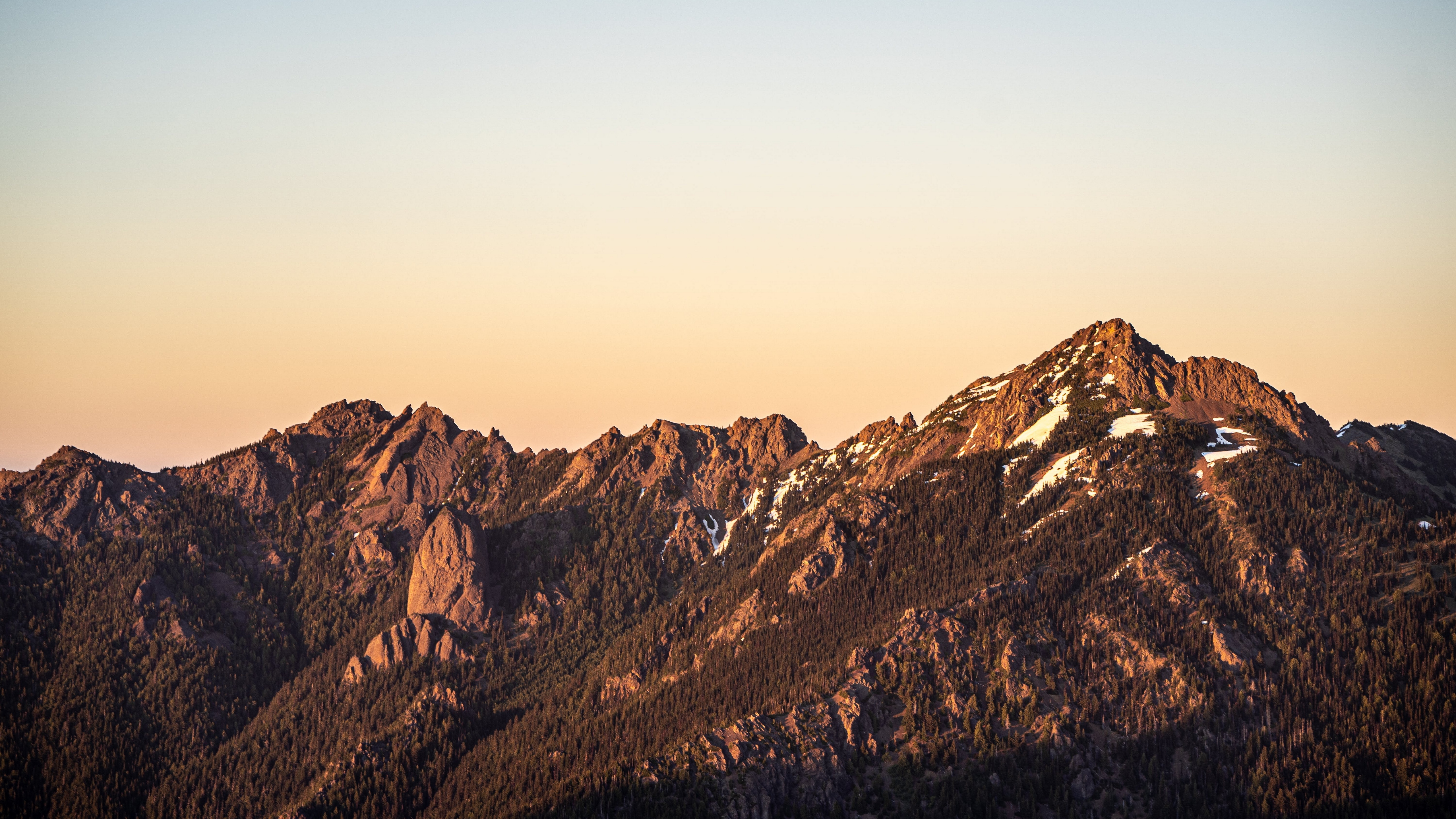 Description: A mountain range with a few snow capped mountains in the distance at sunset or dawn with a clear sky.