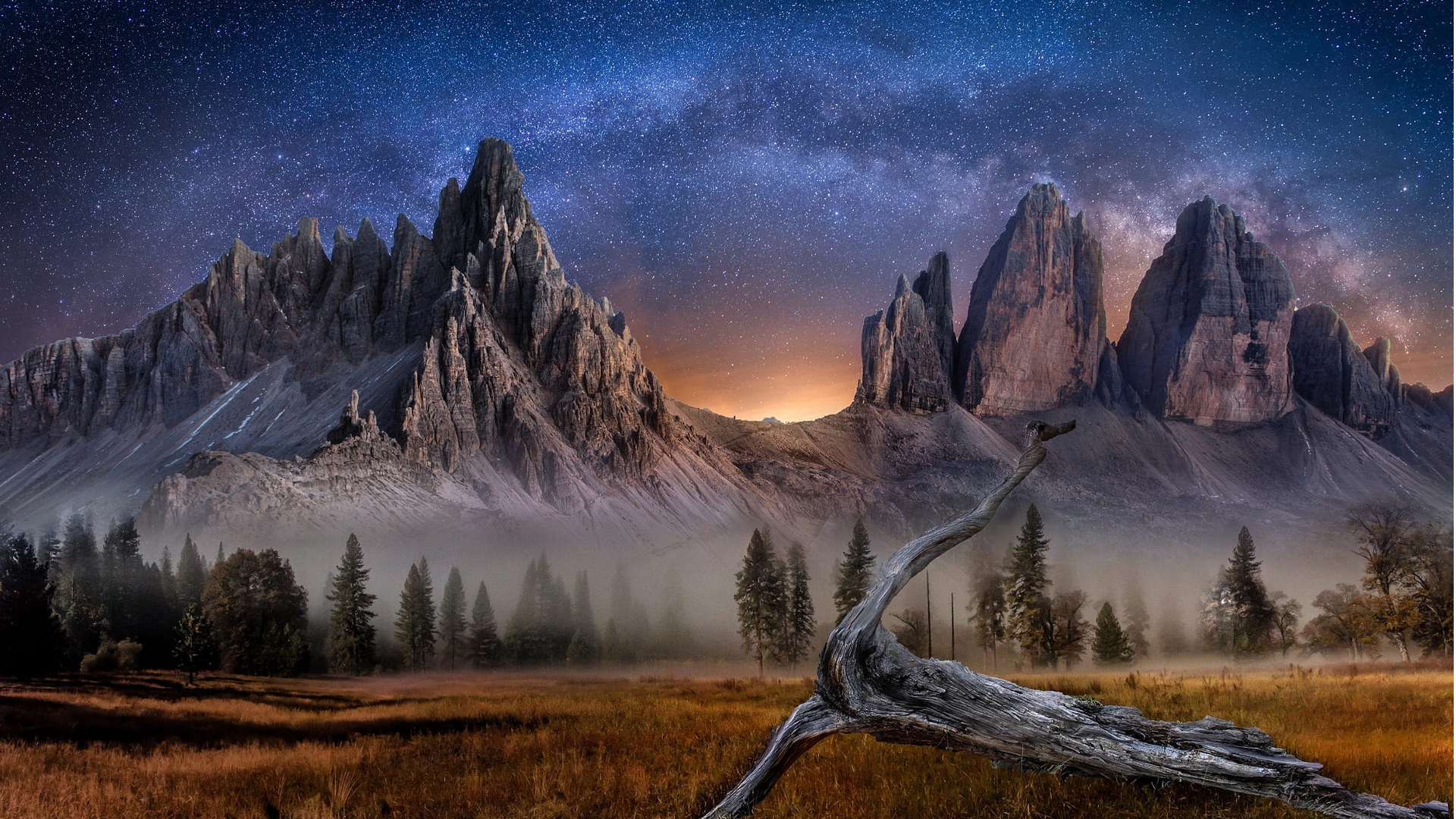 Description: A painting of a mountain range with a tree branch in the foreground and a night sky with stars and clouds.
