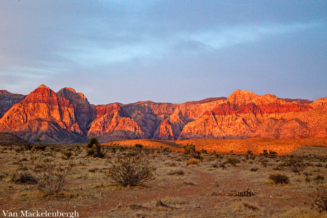 Description: A mountain range with a few trees in the foreground and a blue sky in the background with a few clouds.