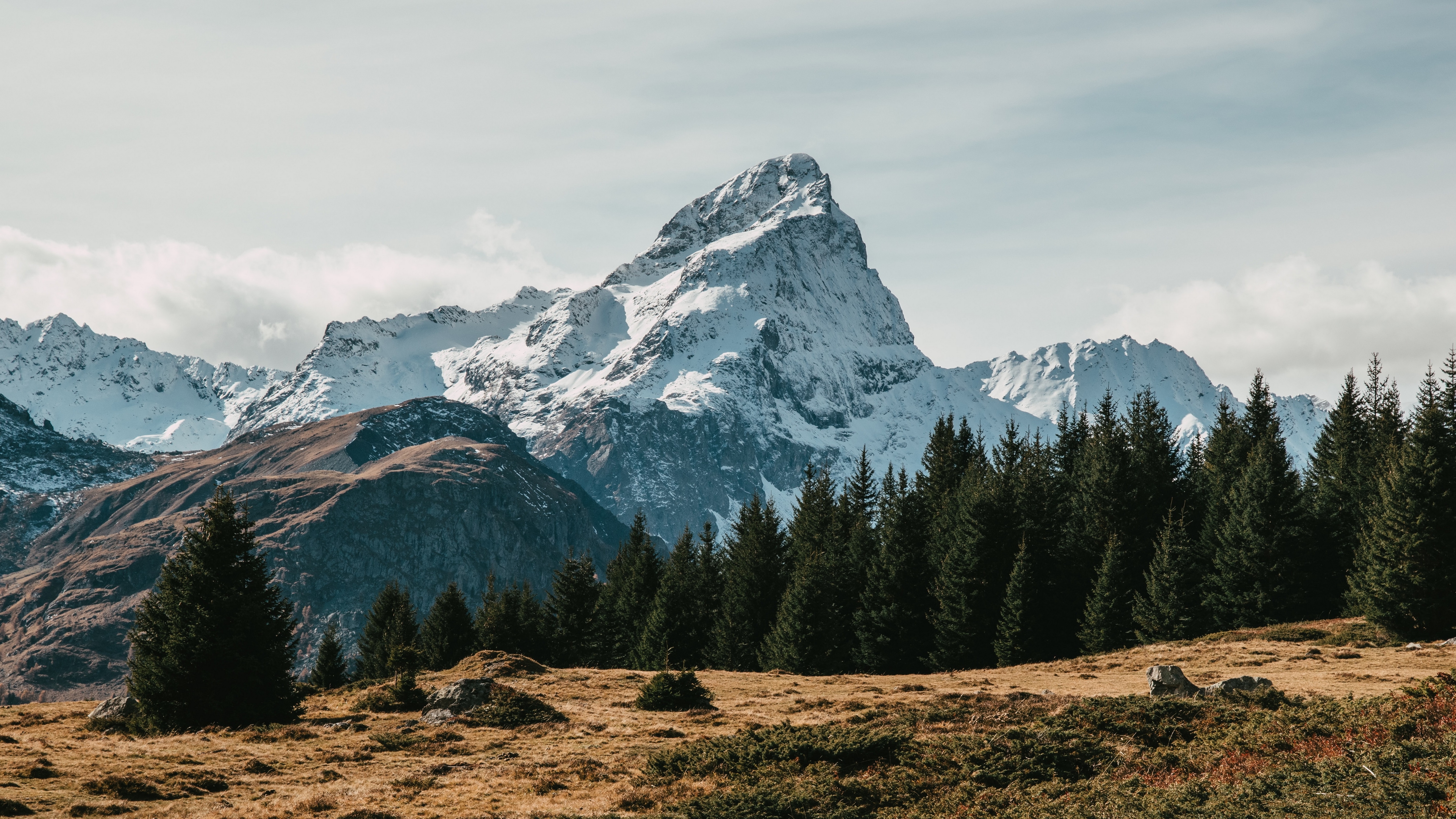 Description: A mountain range with a few trees in the foreground and a few clouds in the background with a few clouds in the sky.