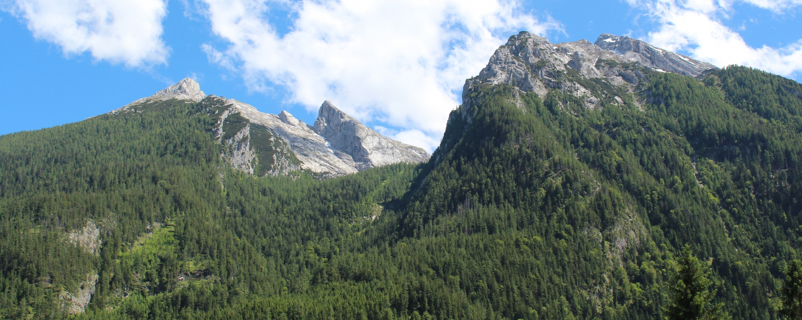 Description: A mountain range with a few trees on the side of it and a few clouds in the sky above.