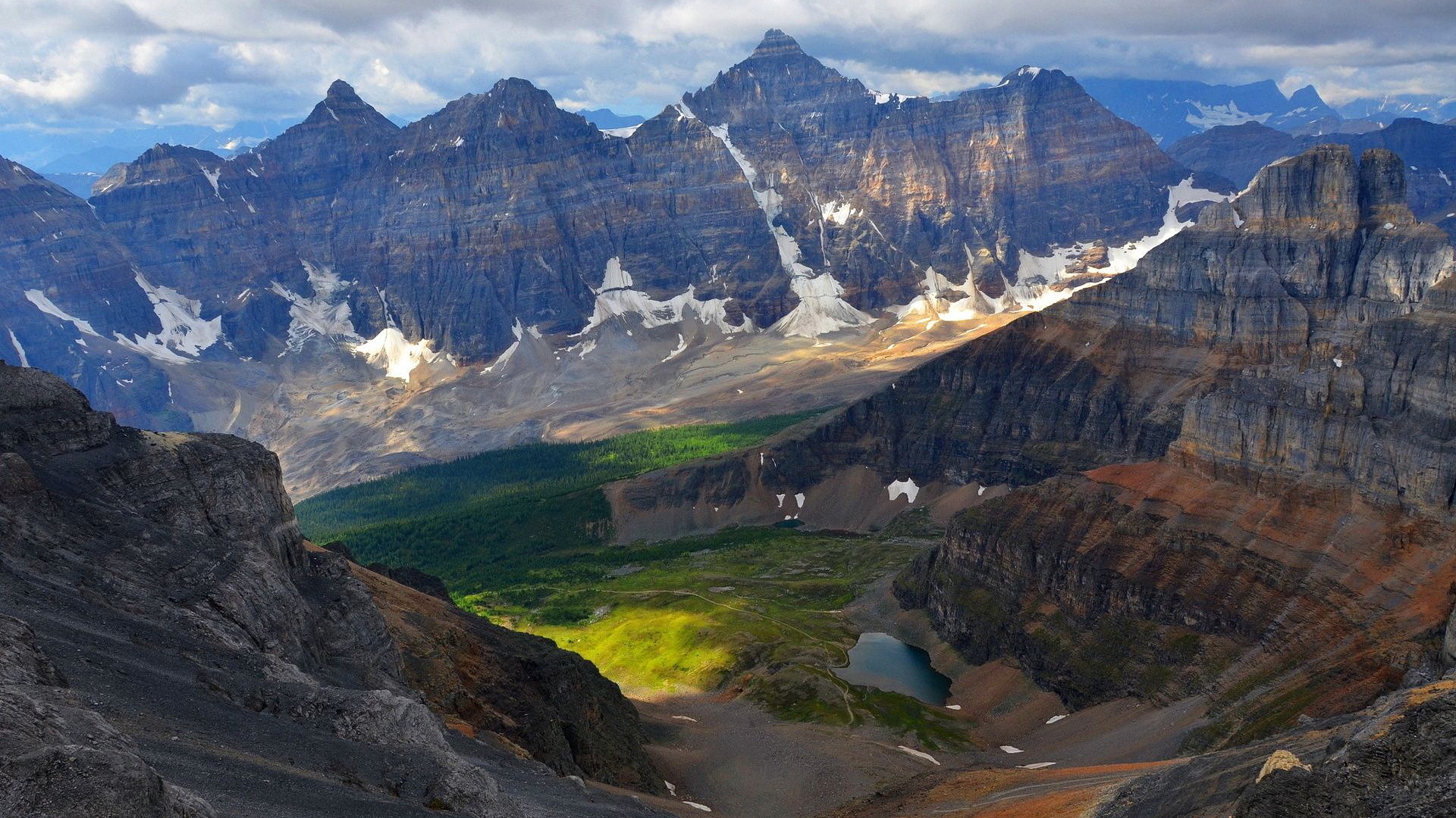 Description: A mountain range with a valley in the middle of it and snow capped mountains in the background.