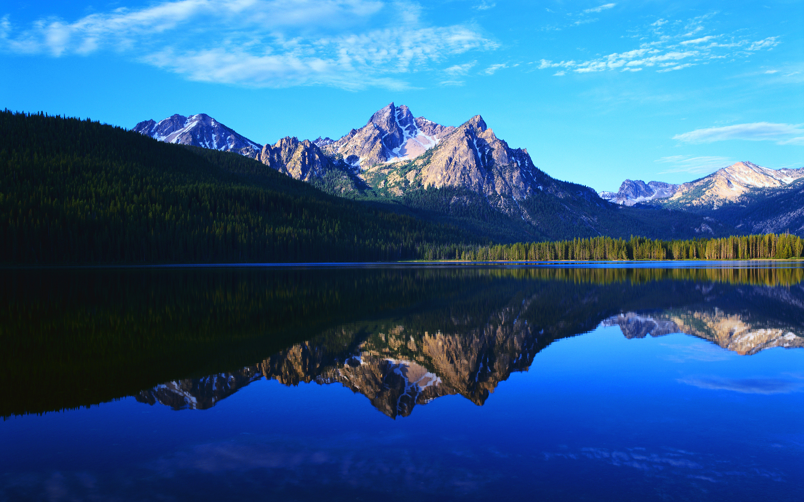 Description: A mountain range is reflected in a still lake with a blue sky and clouds in the background and a few trees in the foreground.