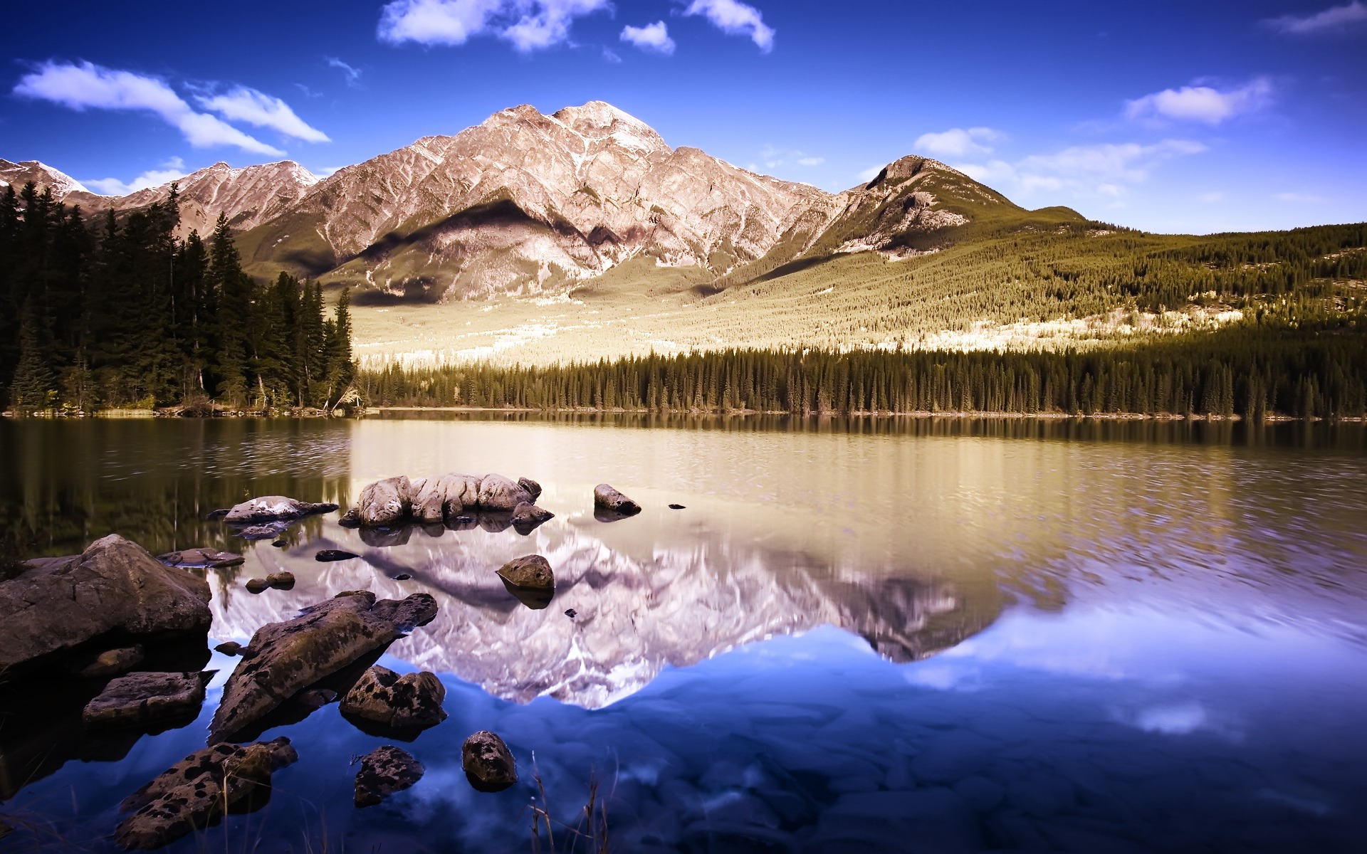 Description: A mountain range is reflected in a lake surrounded by rocks and trees with a blue sky and clouds above.