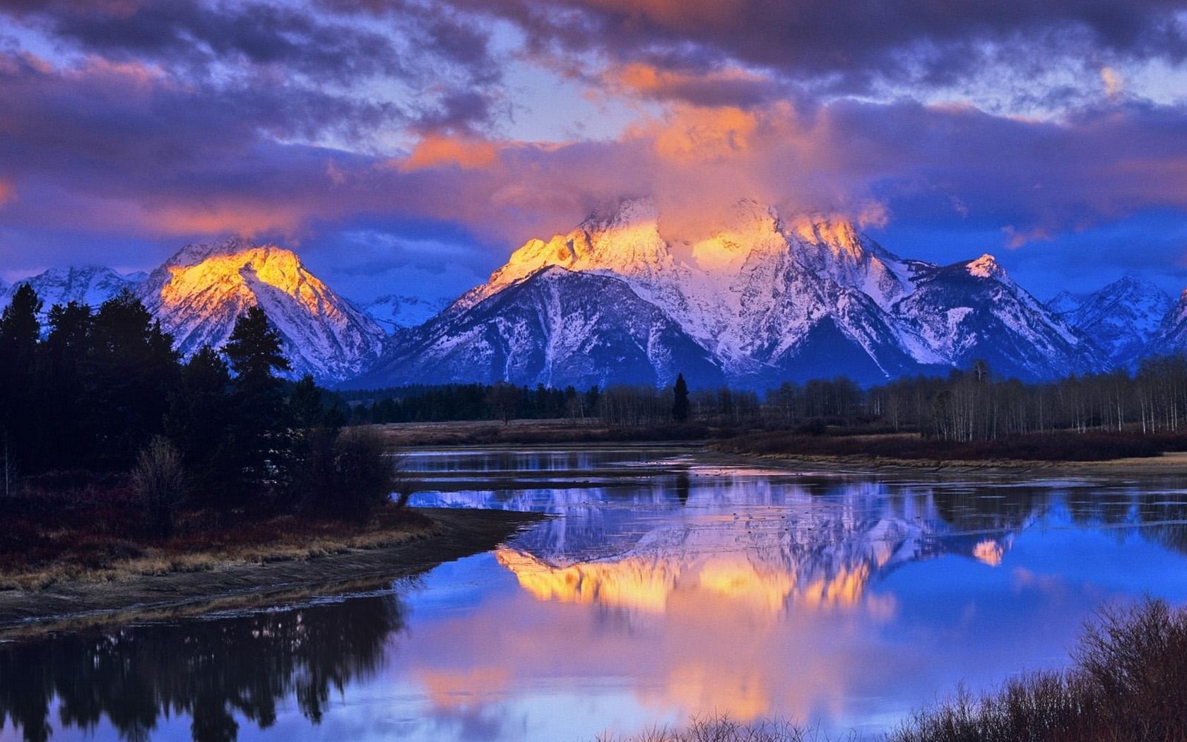 Description: A mountain range is reflected in a lake at sunset with a colorful sky and clouds in the background and a few trees in the foreground.