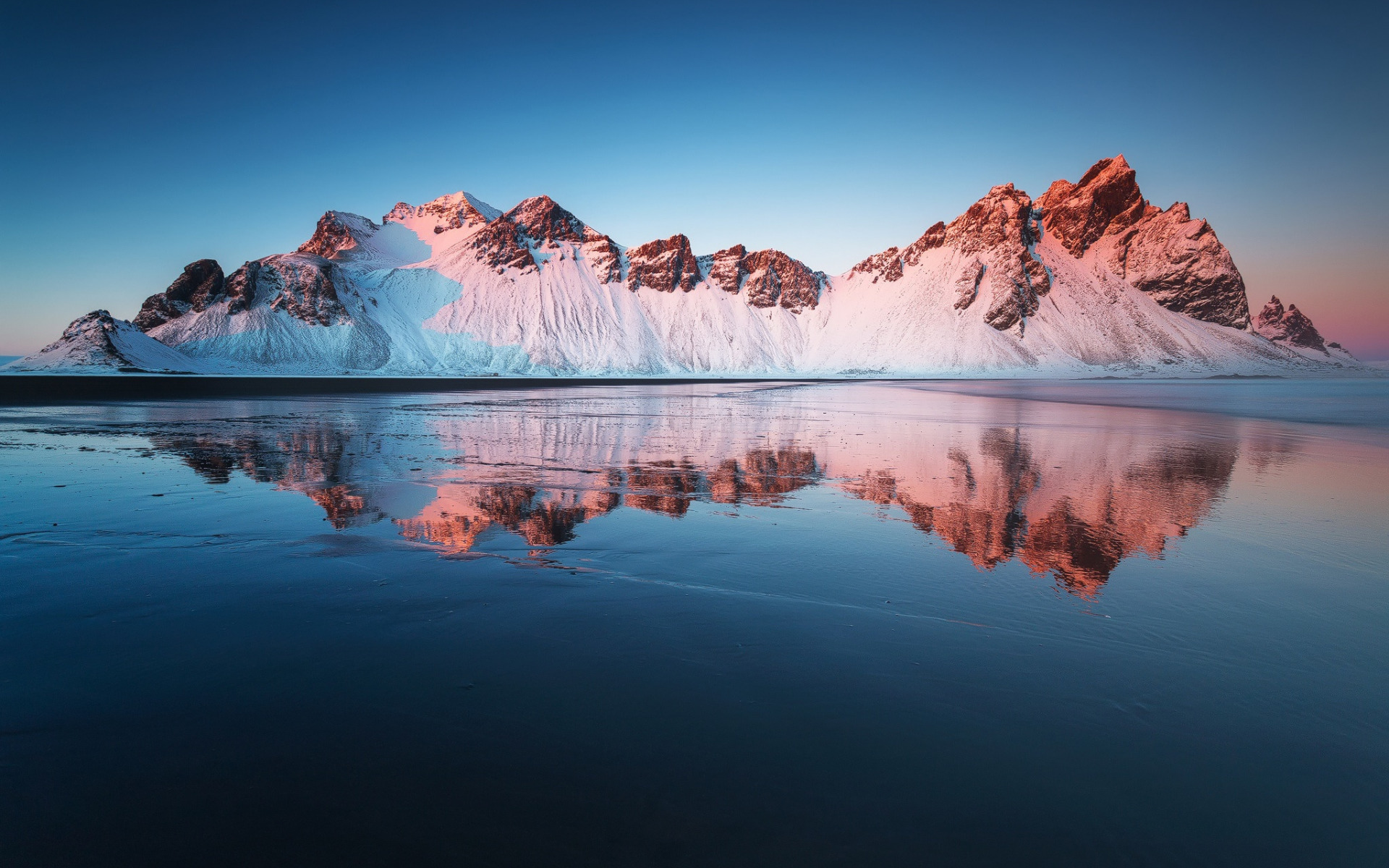 Description: A mountain range is reflected in the water of a lake at sunset or dawn with a pink sky and a blue sky.