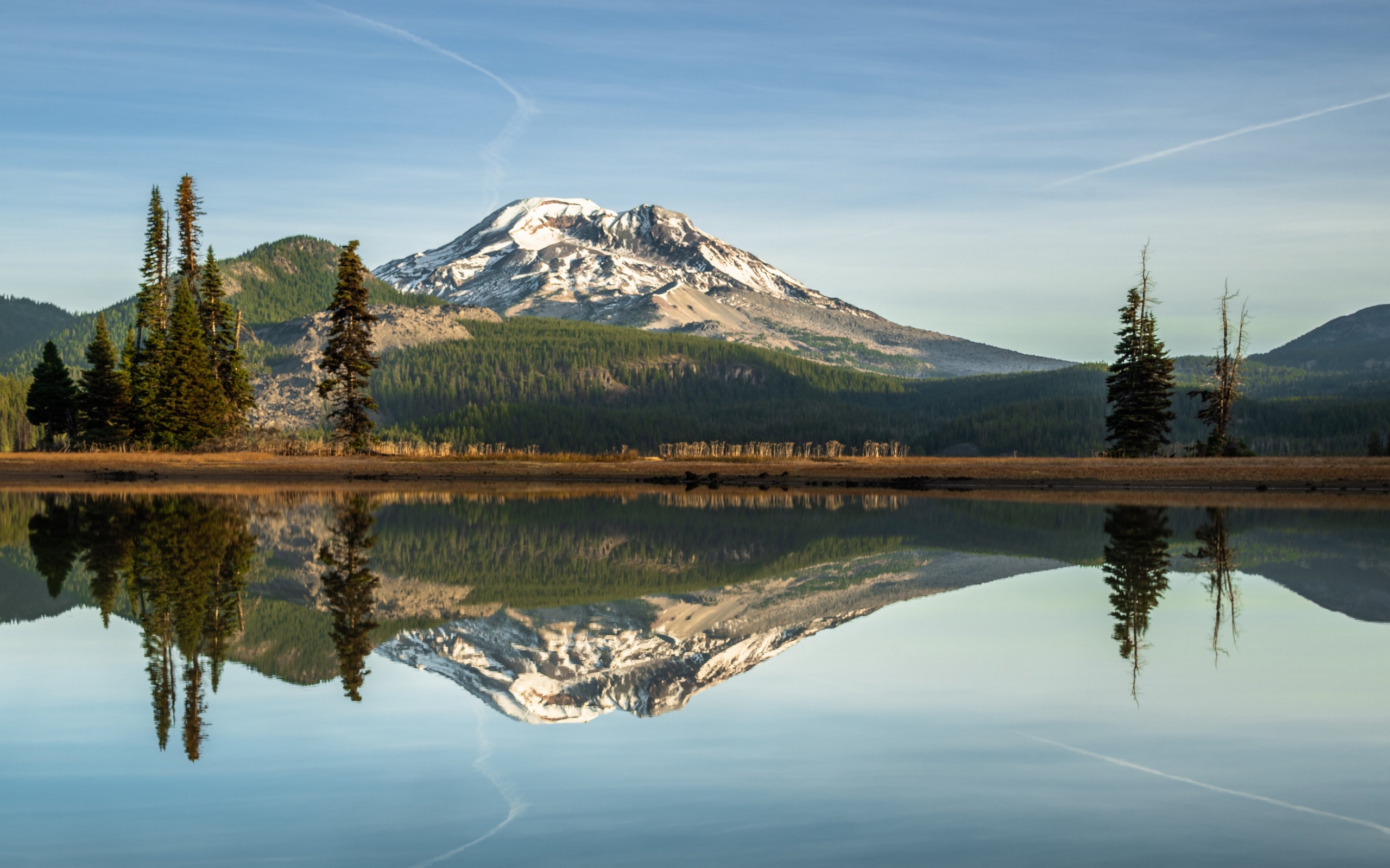 Description: A mountain is reflected in a still lake with trees around it and a clear sky above it.