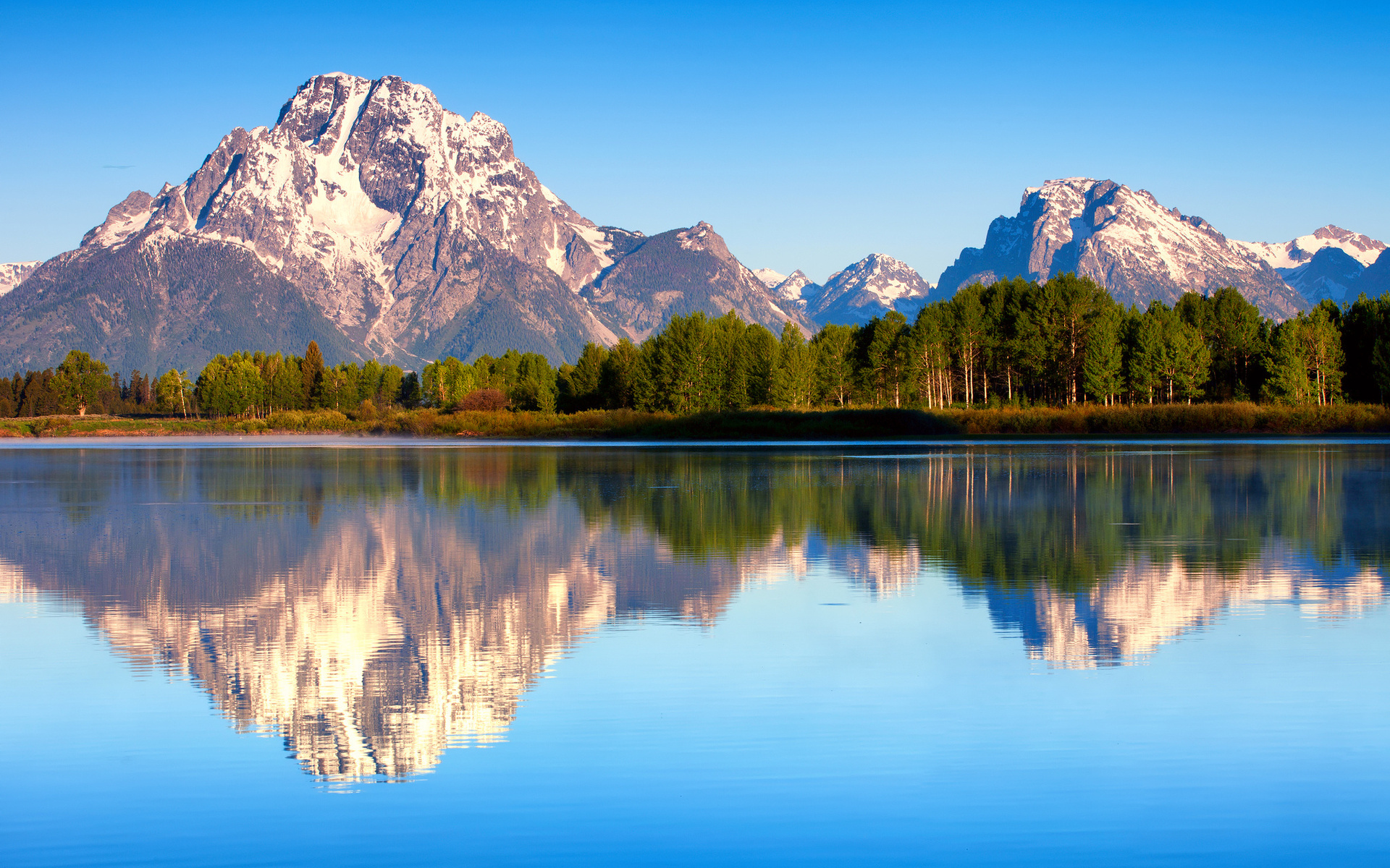 Description: A mountain range is reflected in a lake with trees and mountains in the background.